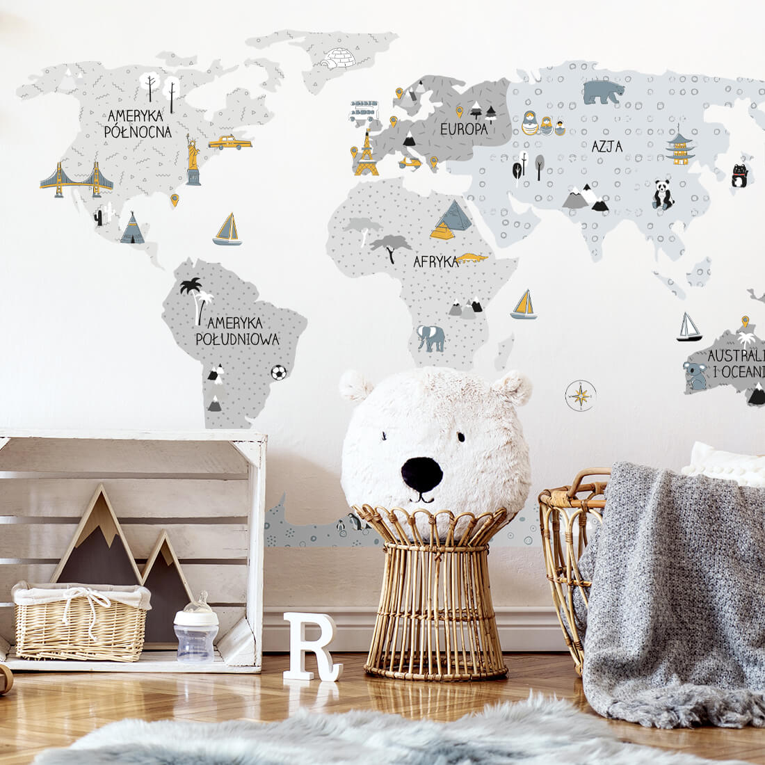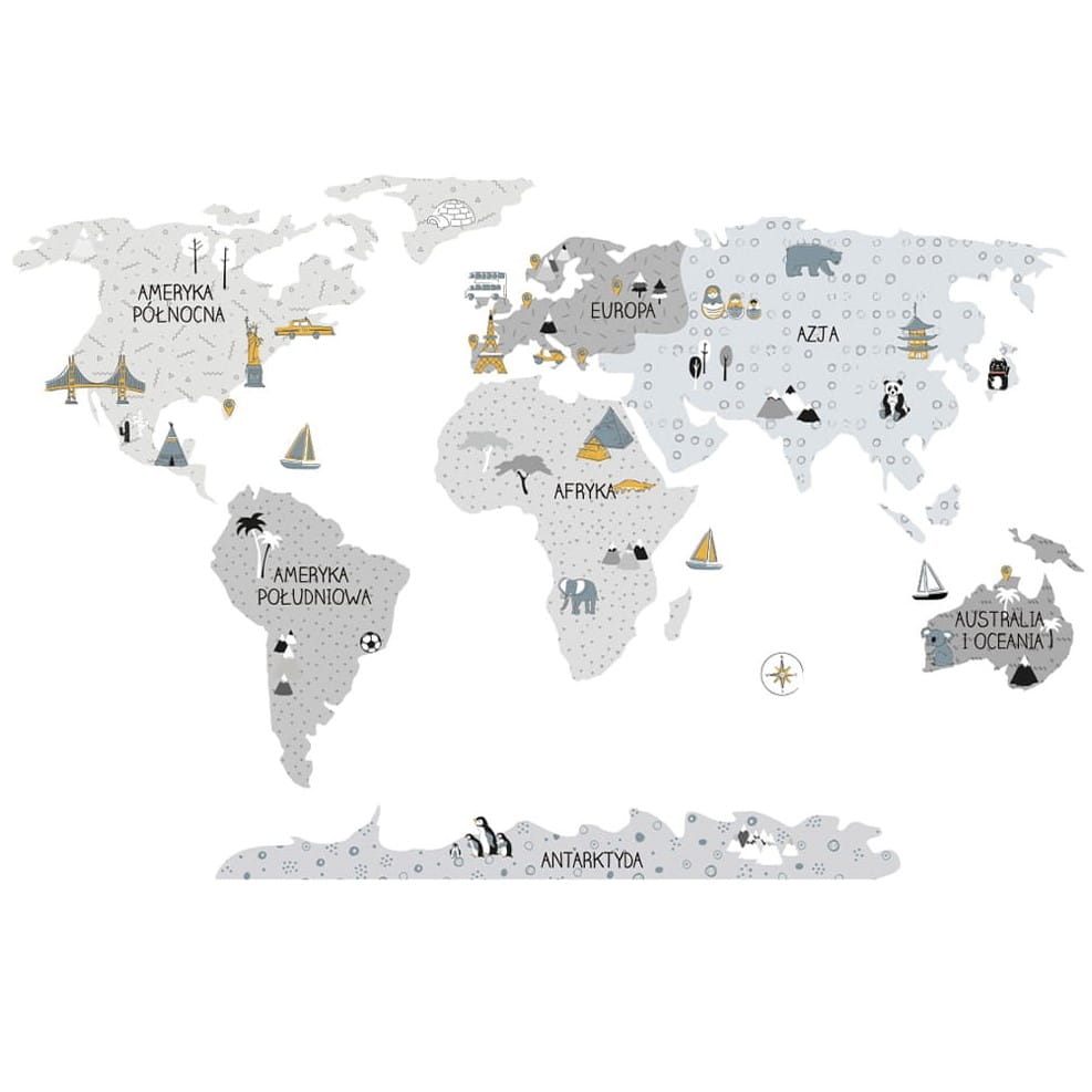 Naklejka dekoracyjna na ścianę Mapa Świata szara to piękna, modna i niezwykła dekoracja pokoju dla dziecka.