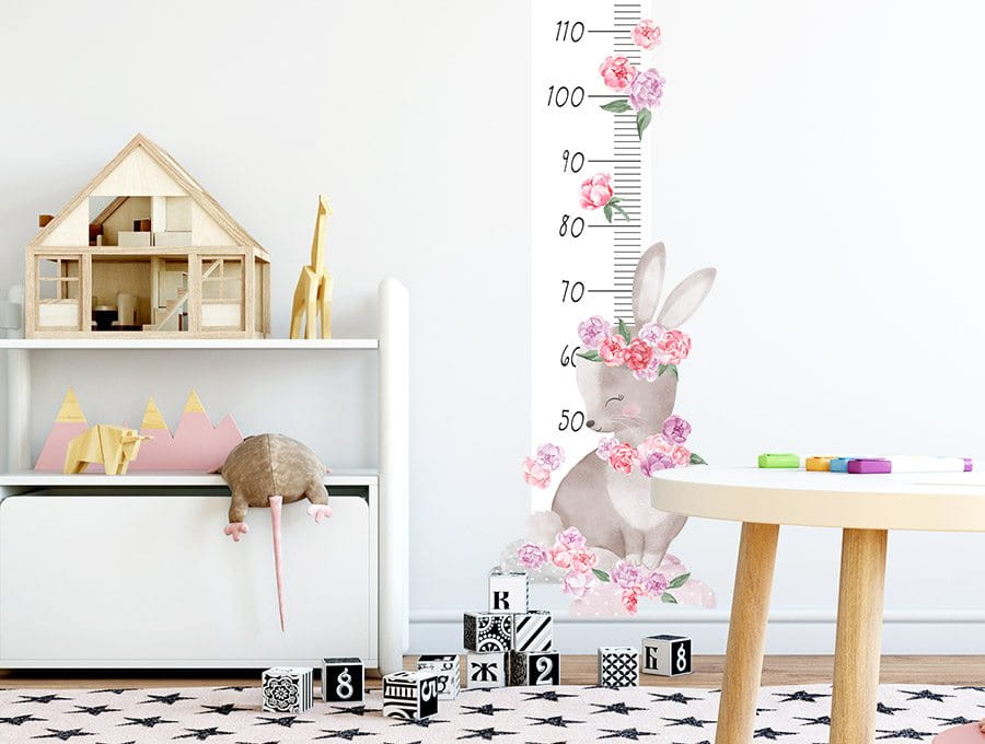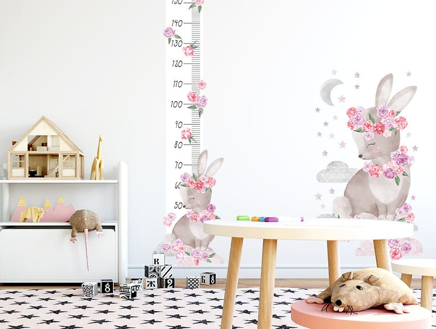 Naklejka dekoracyjna na ścianę z miarką wzrostu Królik Różowy to piękna, modna i niezwykła dekoracja pokoju dla dziecka.