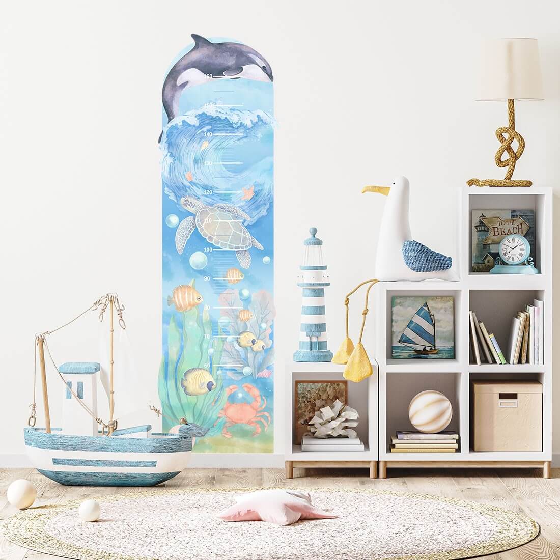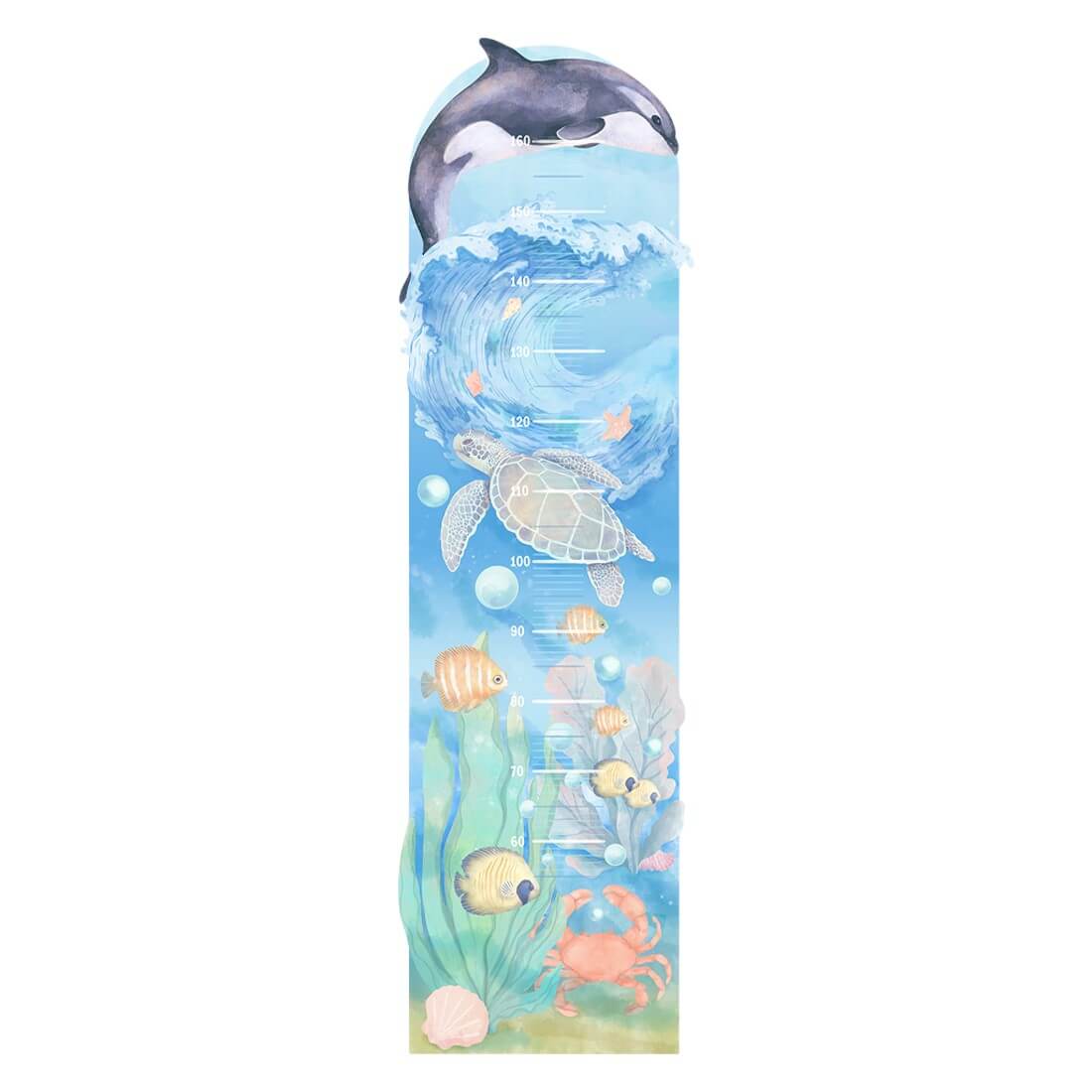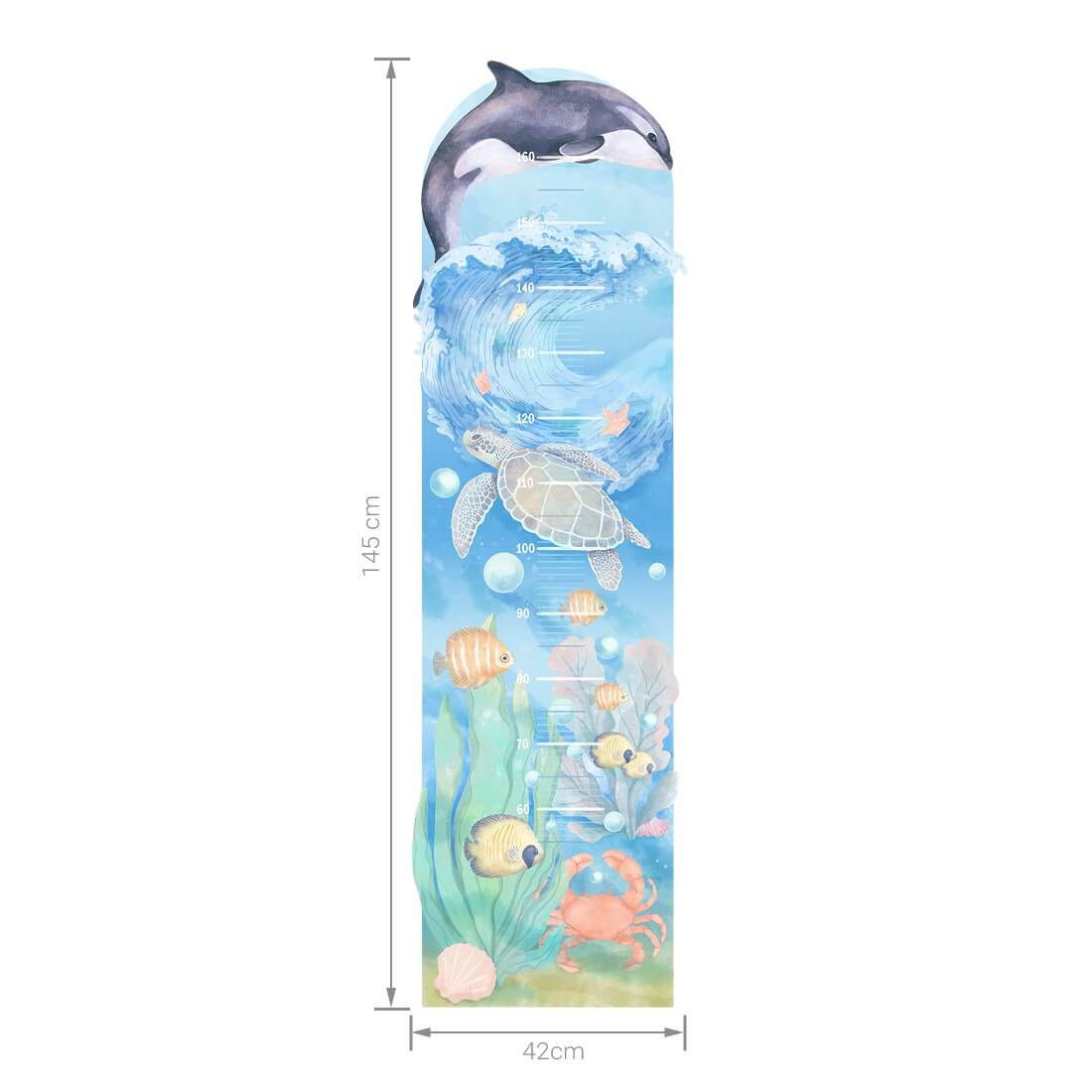 Naklejka na ścianę miarka podwodny świat to oryginalny produkt zaprojektowany i wyprodukowany w Polsce. Wydrukowana jest na najwyższej jakości folii, pokryta matowym laminatem zabezpieczającym przed zarysowaniami, wykonana z największą starannością i dbałością o detale. Naklejka na ścianę nie posiada tła - wycięta jest po obrysie, co oznacza, że można przykleić ją na podłożu w dowolnym kolorze. Naklejkę przykleić można również do wszystkich innych gładkich powierzchni, takich jak meble, szyby, czy lustra.