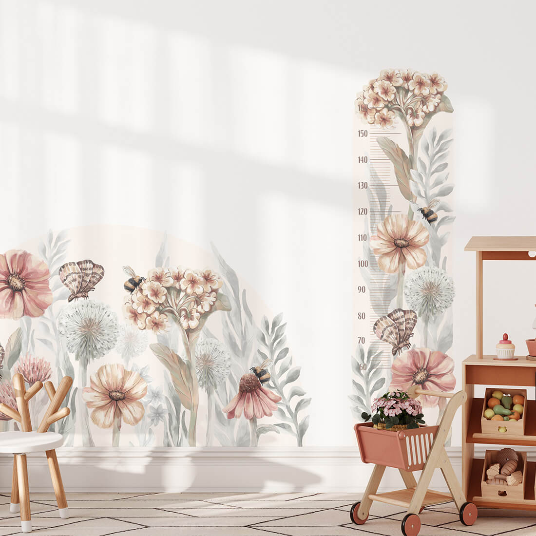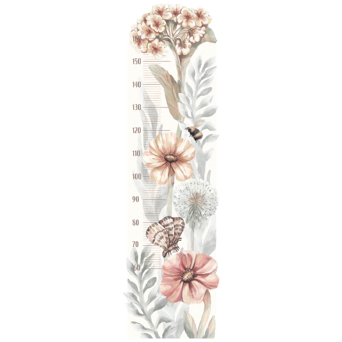 Naklejka na ścianę miarka wzrostu - "miarka polne kwiaty" z uroczymi akwarelowymi kwiatami, motylami oraz pszczołami, stanowi doskonałą propozycję dla osób poszukujących naturalnej i spokojnej dekoracji pokoju dziecka. Doskonale pasuje zarówno do wnętrz dziecięcych utrzymanych w stylu skandynawskim, jak i boho. Kultywowanie tradycji zaznaczania wzrostu dzieci na przestrzeni lat jest praktyką przekazywaną z pokolenia na pokolenie. Miarki wzrostu w formie naklejek na ścianę, które mogą być umieszczone w dowolnym miejscu, umożliwiając zapisywanie kolejnych centymetrów wzrostu dziecka. Każdy element jest starannie wycięty, co otwiera niezliczone możliwości dekoracyjne.