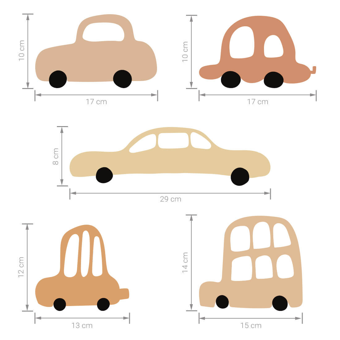 W skład zestawu wchodzą: 5 wersji samochodów (po 4 szt.). Dokładne wymiary naklejek podane na ostatnim zdjęciu.