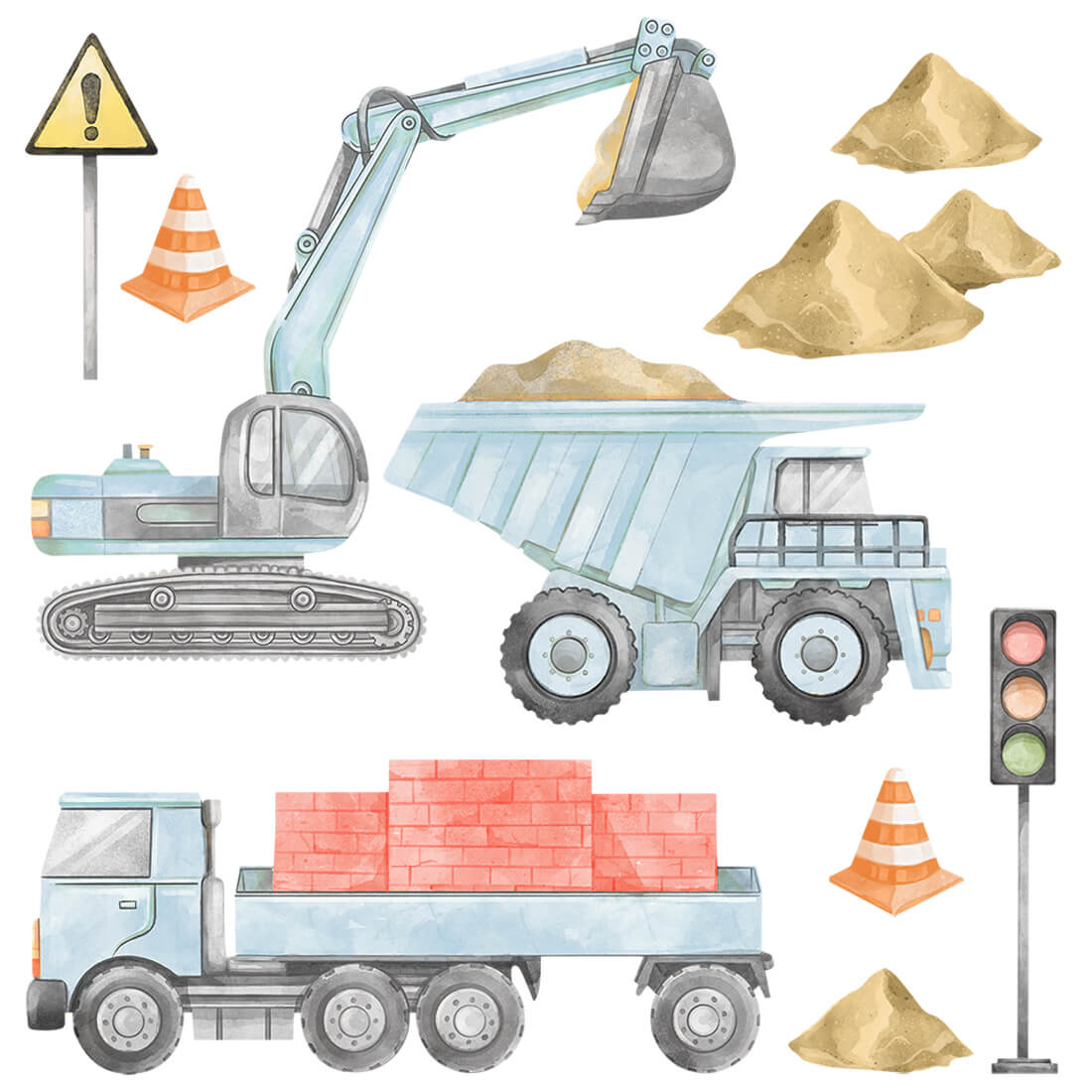 W skład zestawu wchodzą: koparka, ciężarówka, wywrotka, ceglane murki oraz znaki. Dokładne wymiary podane na ostatnim zdjęciu.