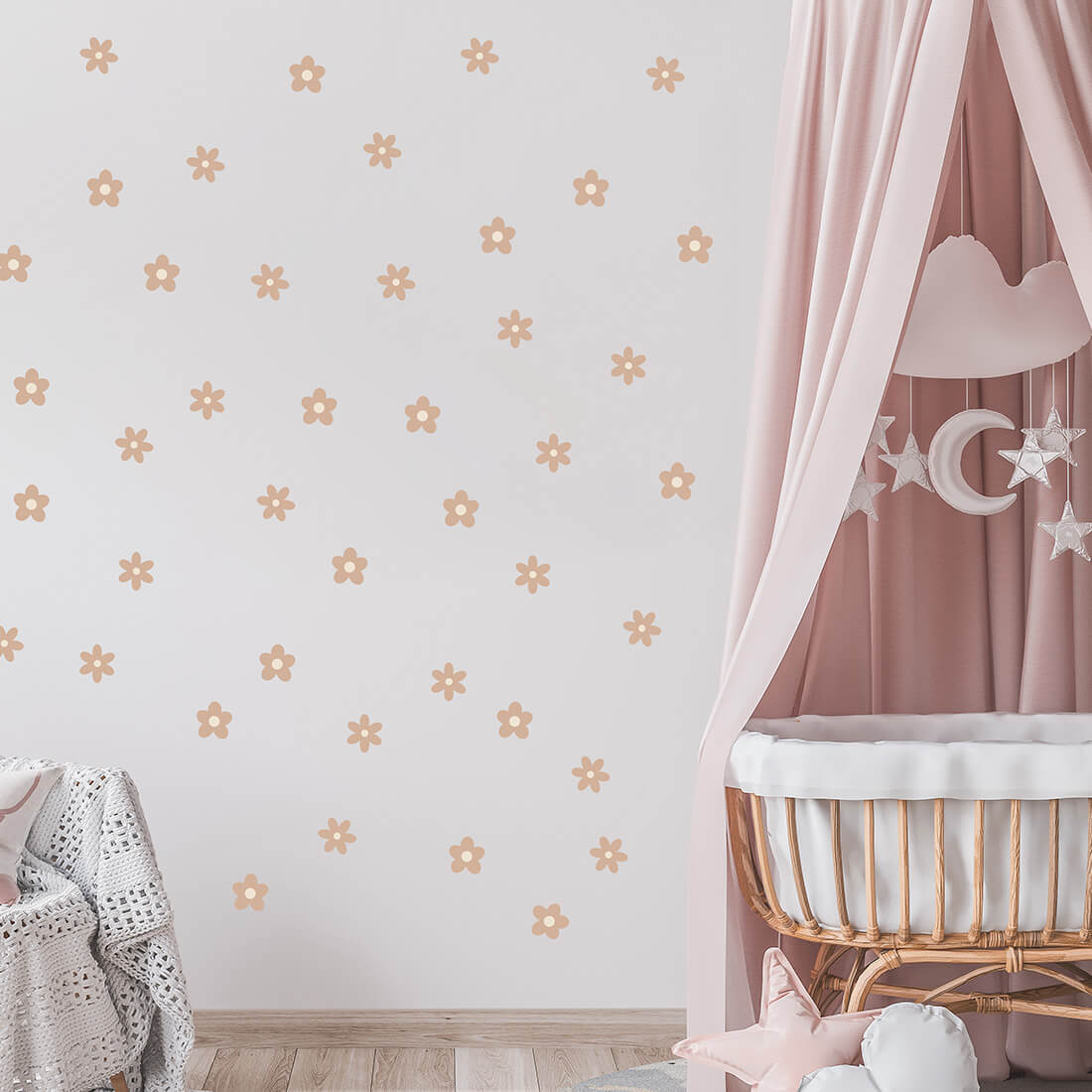 Zestaw naklejek na ścianę (59 szt.) - naklejki stokrotki można dowolnie układać na ścianie i tworzyć efekt tapety. Kwiatki występują w dwóch kształtach i dwóch rozmiarach. Zostały stworzone z myślą o wszystkich fanach delikatnych motywów i naturalnych beżowych kolorów. Dzięki swojej wyjątkowej formie doskonale sprawdzą się w dziecięcych pokojach zarówno w stylizacjach skandynawskich, jak i boho.