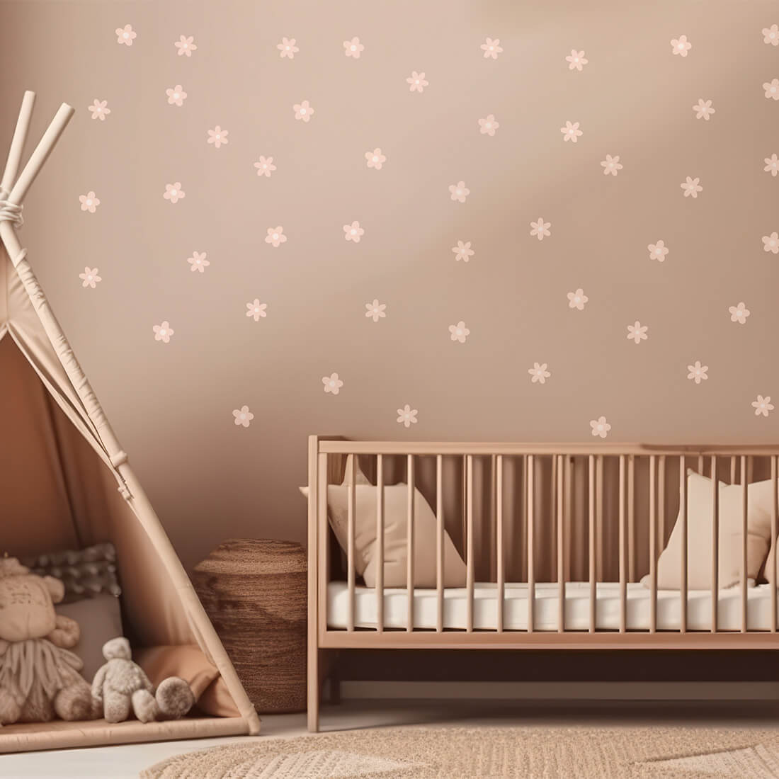 Zestaw naklejek na ścianę (59 szt.) - naklejki stokrotki można dowolnie układać na ścianie i tworzyć efekt tapety. Kwiatki występują w dwóch kształtach i dwóch rozmiarach. Zostały stworzone z myślą o wszystkich fanach delikatnych motywów i naturalnych beżowych kolorów. Dzięki swojej wyjątkowej formie doskonale sprawdzą się w dziecięcych pokojach zarówno w stylizacjach skandynawskich, jak i boho.