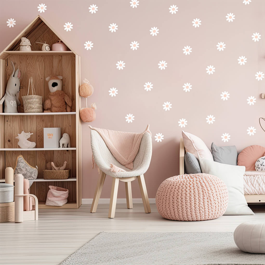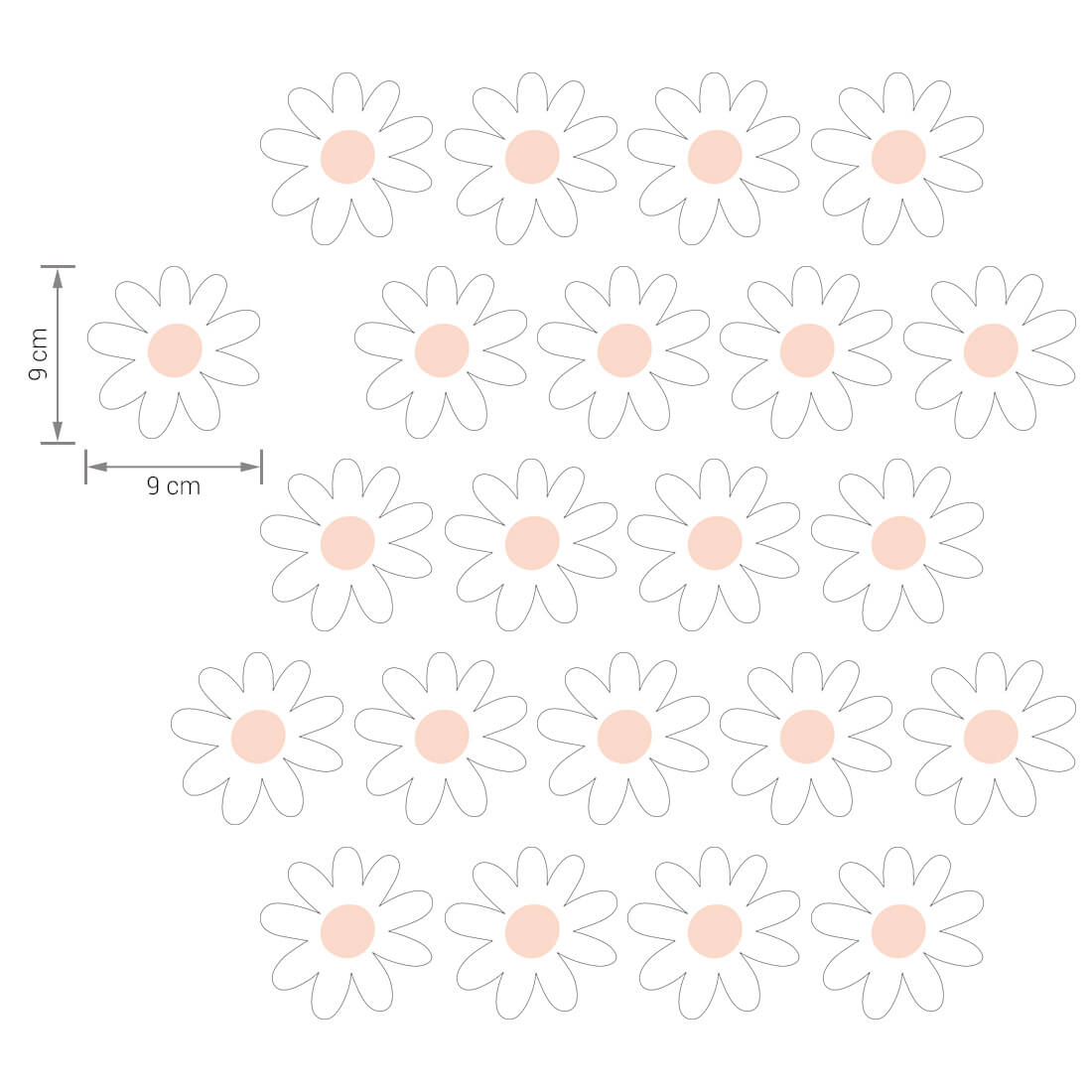 Zestaw naklejek na ścianę (22 szt.) - naklejki stokrotki można dowolnie układać na ścianie i tworzyć efekt tapety. Kwiatki występują w jednym kształcie i jednym rozmiarze. Zostały stworzone z myślą o wszystkich fanach delikatnych motywów i naturalnych beżowych kolorów. Dzięki swojej wyjątkowej formie doskonale sprawdzą się w dziecięcych pokojach zarówno w stylizacjach skandynawskich, jak i boho.