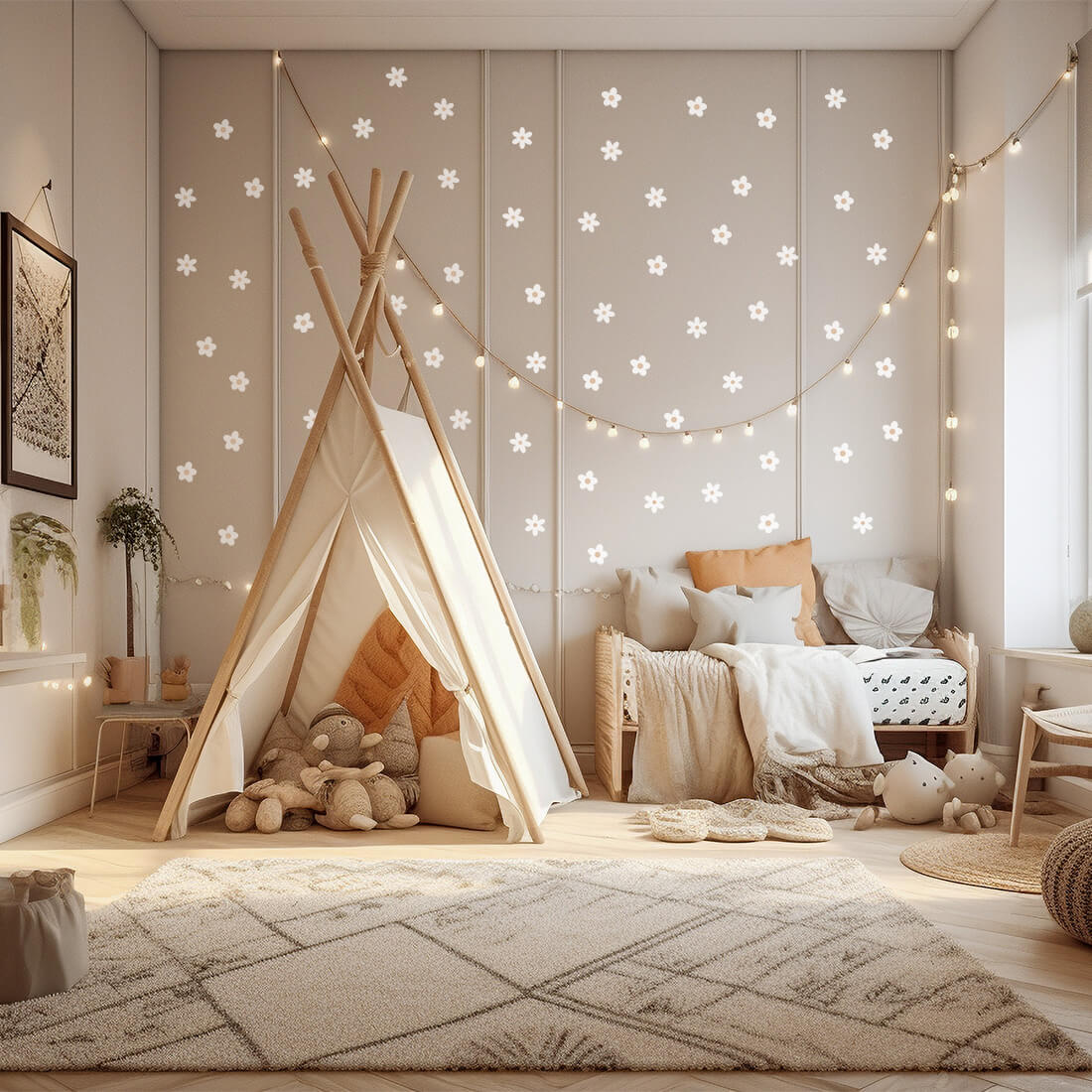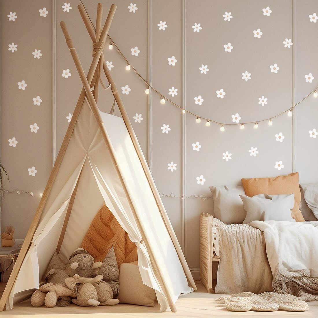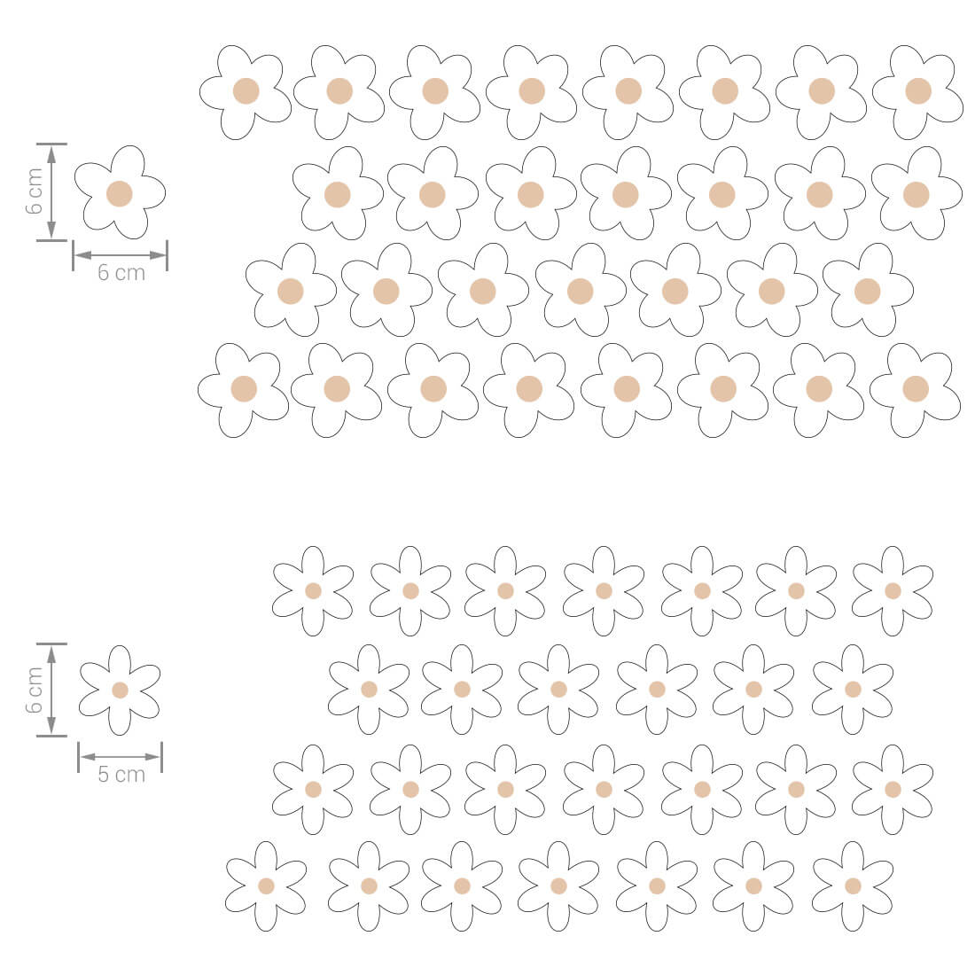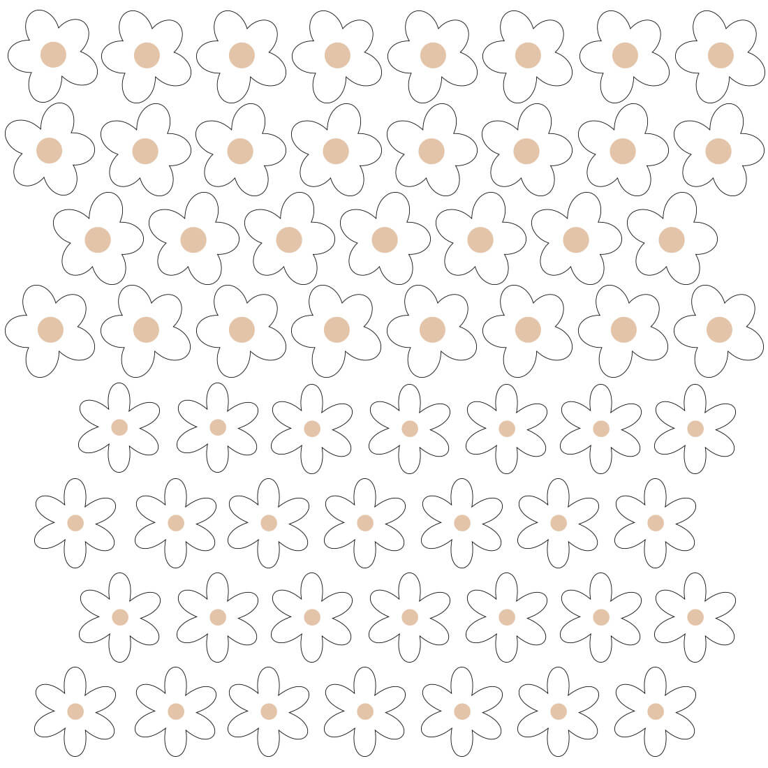 Zestaw naklejek na ścianę (59 szt.) - naklejki stokrotki można dowolnie układać na ścianie i tworzyć efekt tapety. Kwiatki występują w dwóch kształtach i dwóch rozmiarach. Zostały stworzone z myślą o wszystkich fanach delikatnych motywów i naturalnych beżowych kolorów. Dzięki swojej wyjątkowej formie doskonale sprawdzą się w dziecięcych pokojach zarówno w stylizacjach skandynawskich, jak i boho.