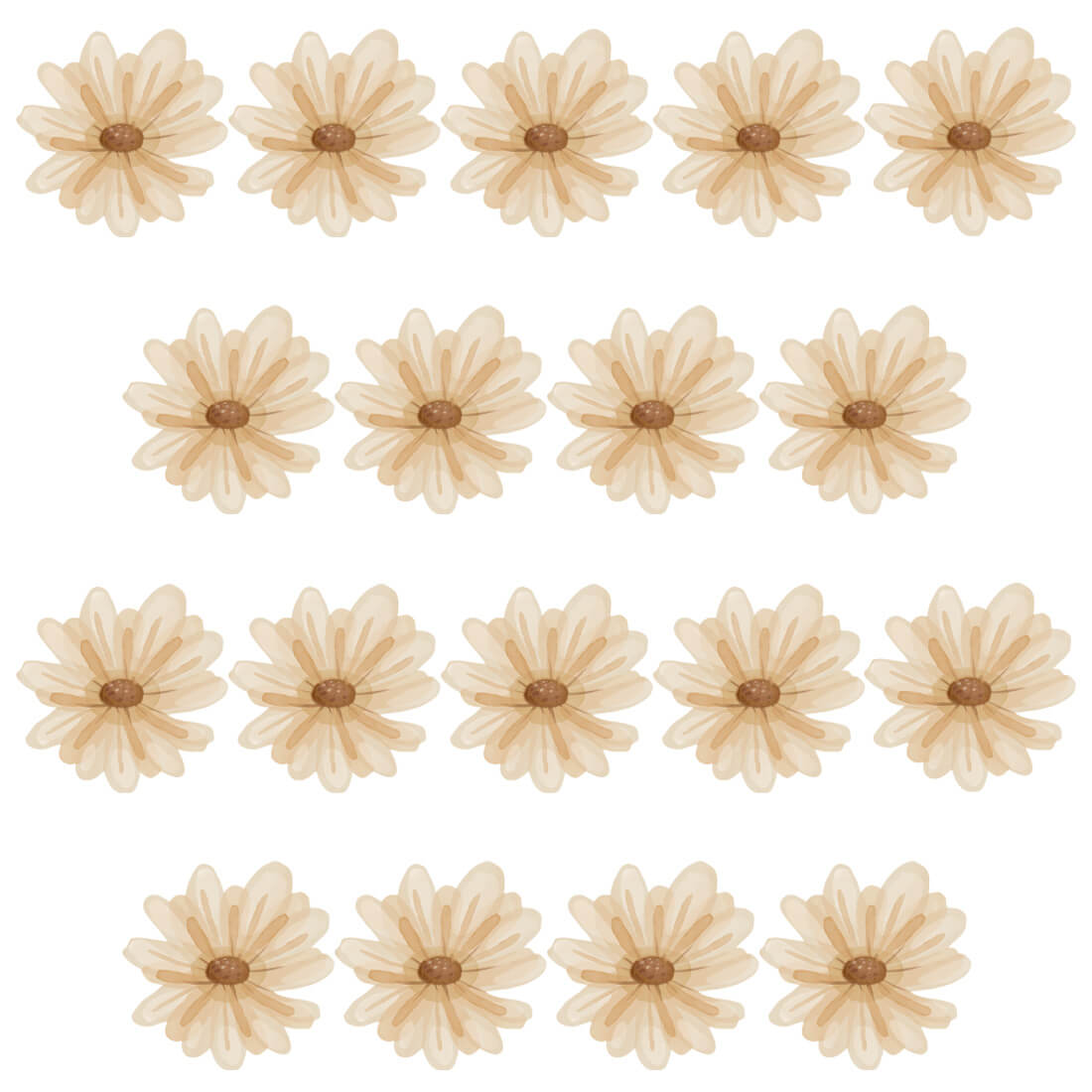 Zestaw naklejek na ścianę (18 szt.) - naklejki stokrotki boho można dowolnie układać na ścianie i tworzyć efekt tapety. Kwiatki występują w jednym kształcie i jednym rozmiarze. Zostały stworzone z myślą o wszystkich fanach delikatnych motywów i naturalnych beżowych kolorów. Dzięki swojej wyjątkowej formie doskonale sprawdzą się w dziecięcych pokojach zarówno w stylizacjach skandynawskich, jak i boho. Cała seria kwiatów łąka została zaprojektowana tak, aby idealnie ze sobą współgrała i tworzyła spójną kompozycję.