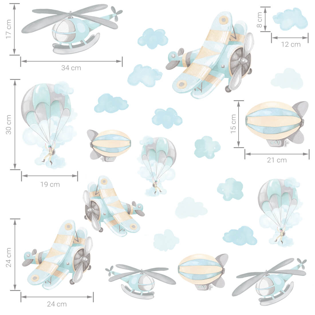 W skład zestawu wchodzą: samoloty (3 szt.), sterowce (3 szt.), spadochroniarze (3 szt.), helikoptery (3 szt.) i chmurki.