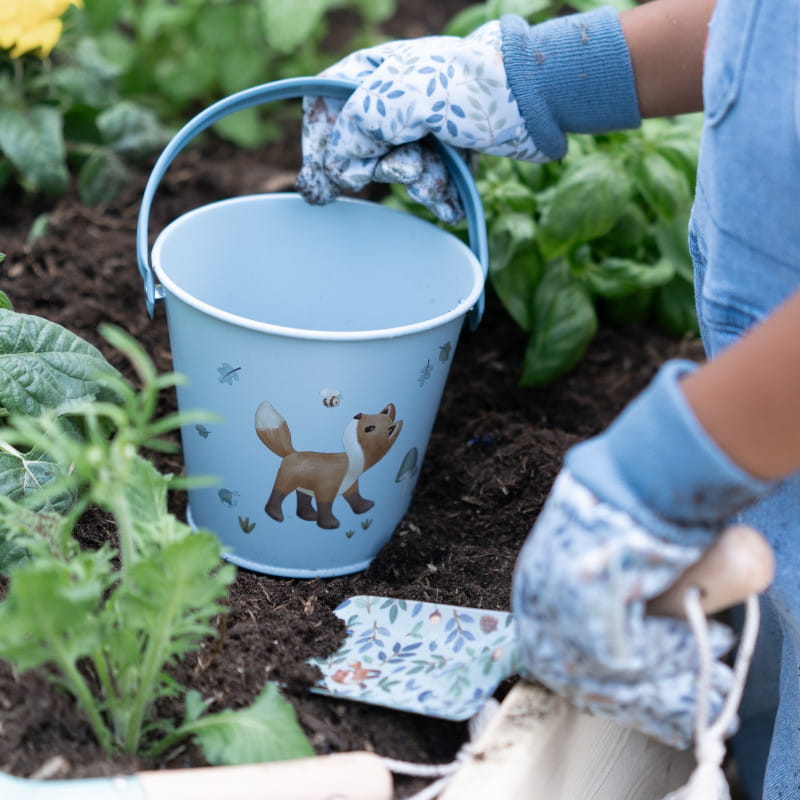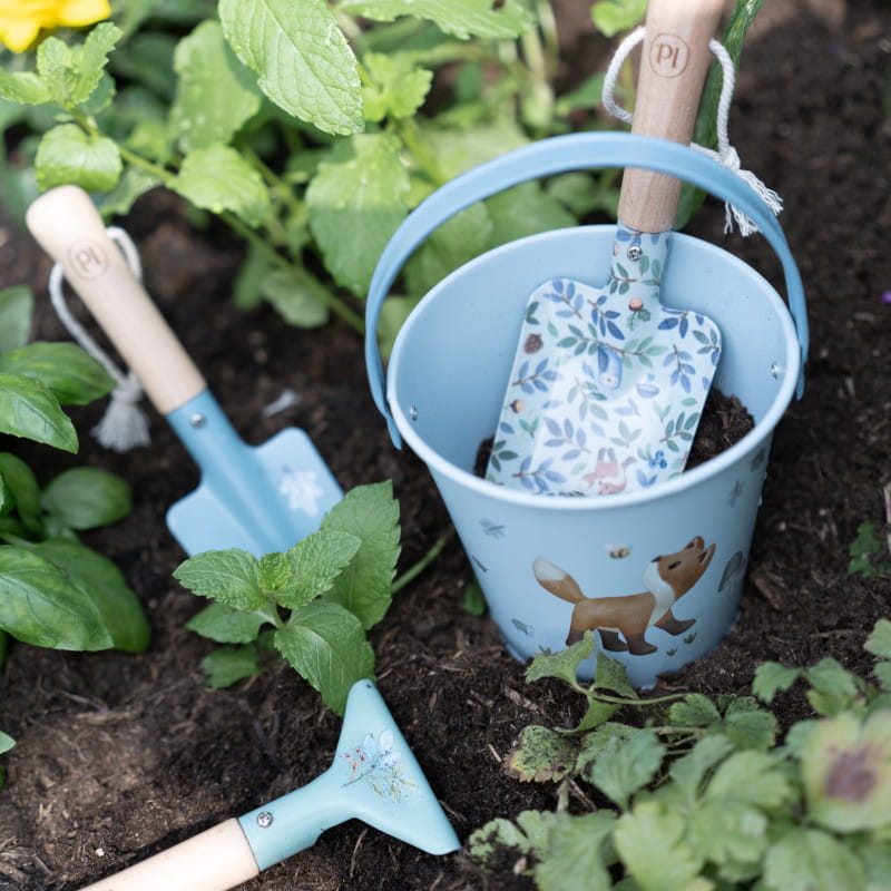 Zestaw zawiera dwie łopatki i grabki, wszystkie wykonane z wytrzymałego metalu z drewnianymi uchwytami wygodnymi dla małych rączek. Każdy element jest ozdobiony pięknymi ilustracjami i kolorami z kolekcji Forest Friends. Poręczne sznurki ułatwiają odwieszanie narzędzi po zakończeniu zabawy w ogrodzie.