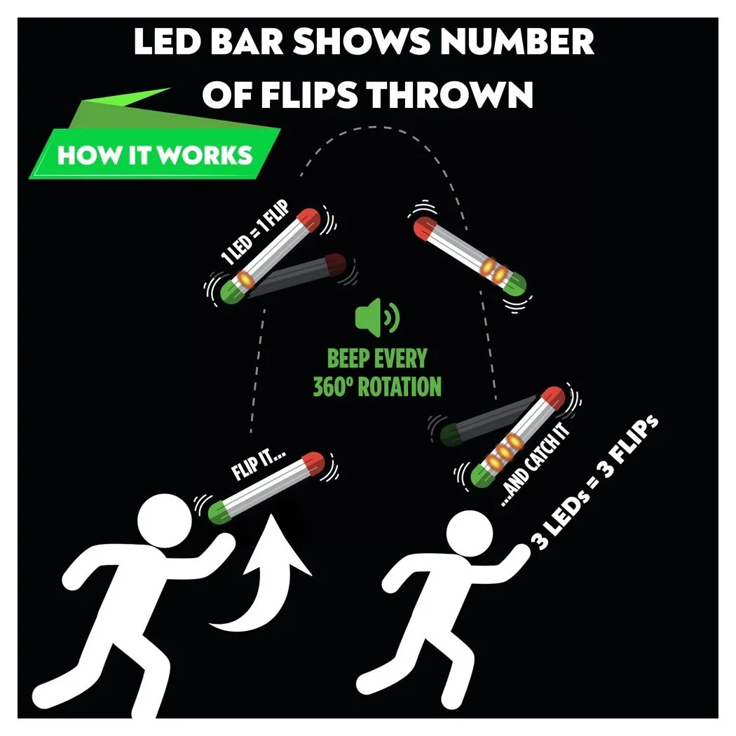 Po złapaniu, liczba obrotów wyświetla się za pomocą kolorowego paska LED, co pozwala na śledzenie postępów i rywalizację z innymi graczami. Idealna dla osób w każdym wieku, Stickflip rozwija koordynację ręka-oko oraz refleks.