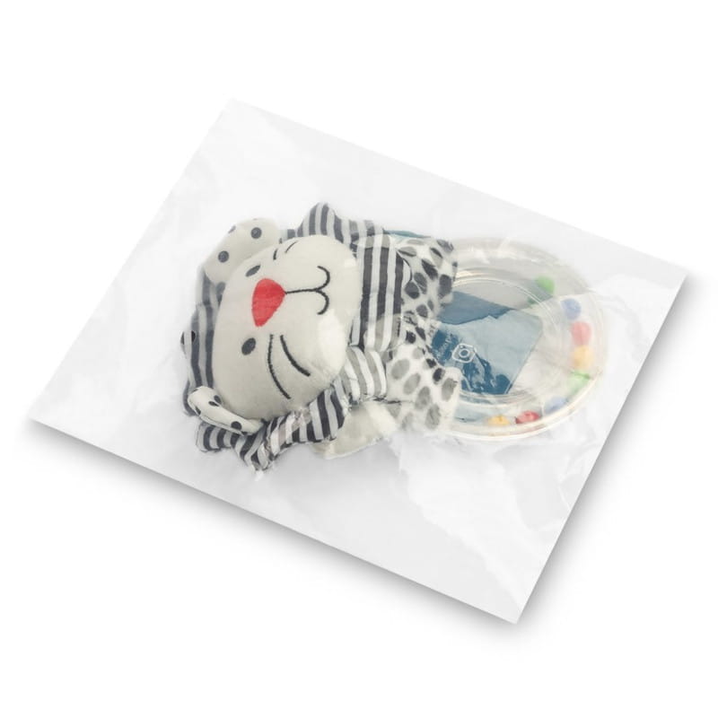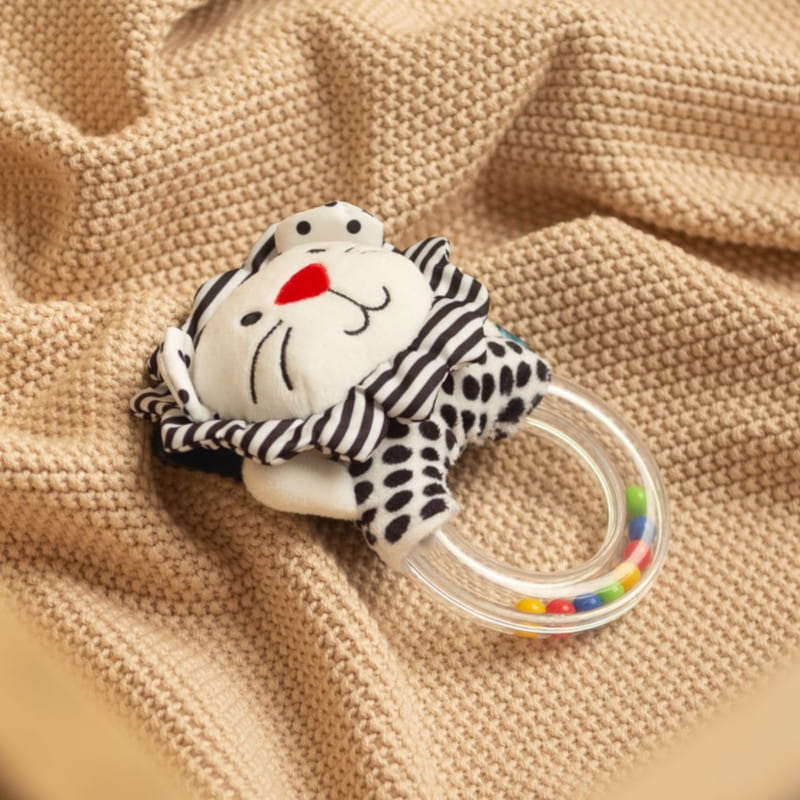 Grzechotka dla niemowląt w kontrastujących odcieniach czerni i bieli została stworzona z myślą o stymulacji wzroku i rozwoju sensorycznym maluszka.