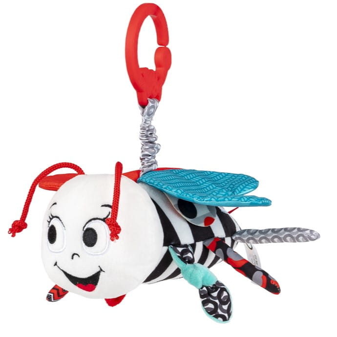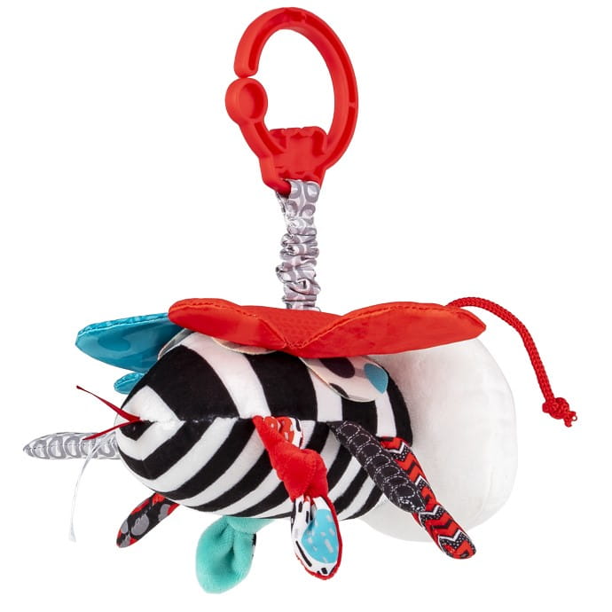 Pszczółka posiada ukryty dzwoneczek, a dzięki temu, że przyczepiona jest do materiałowej harmonijki, po pociągnięciu w dół, podskoczy, wydając przy tym wesoły dźwięk.