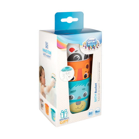 Kolorowe, plastikowe kubeczki. Zestaw zawiera 3 kubeczki - wiaderka z grafiką zwierzątek. Na spodzie dwóch kubeczków znajdują się dziurki do eksperymentowania i zabawy wodą. Jedno wiaderko jest tradycyjne bez dziurek, dzięki czemu można nabierać i przelewać wodę. To wiaderko może posłużyć również do spłukiwania włosów dziecka.