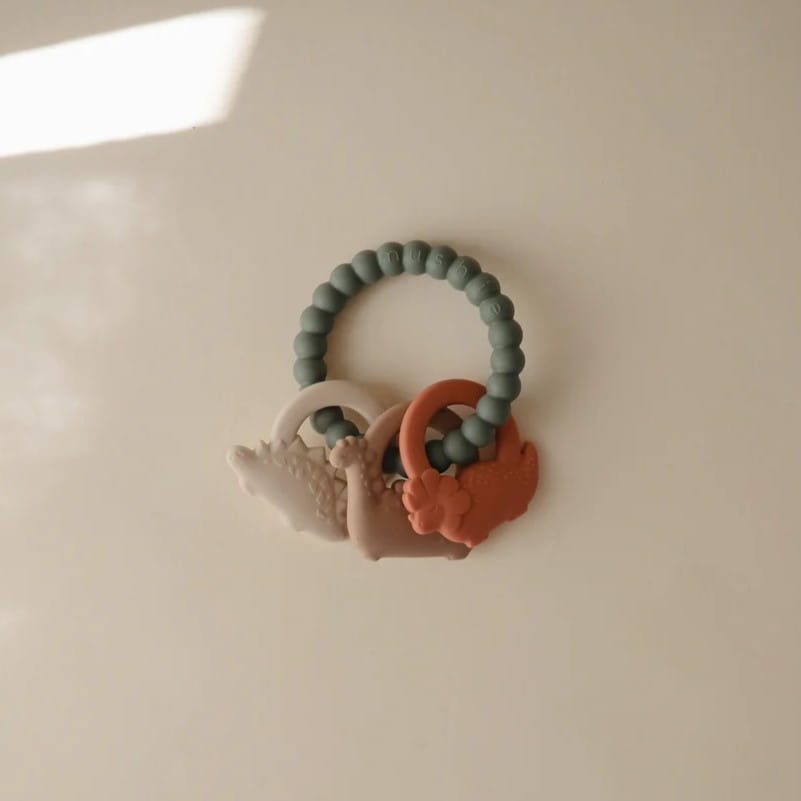 Gryzak silikonowy na kółku Dino marki Mushie.