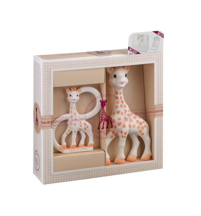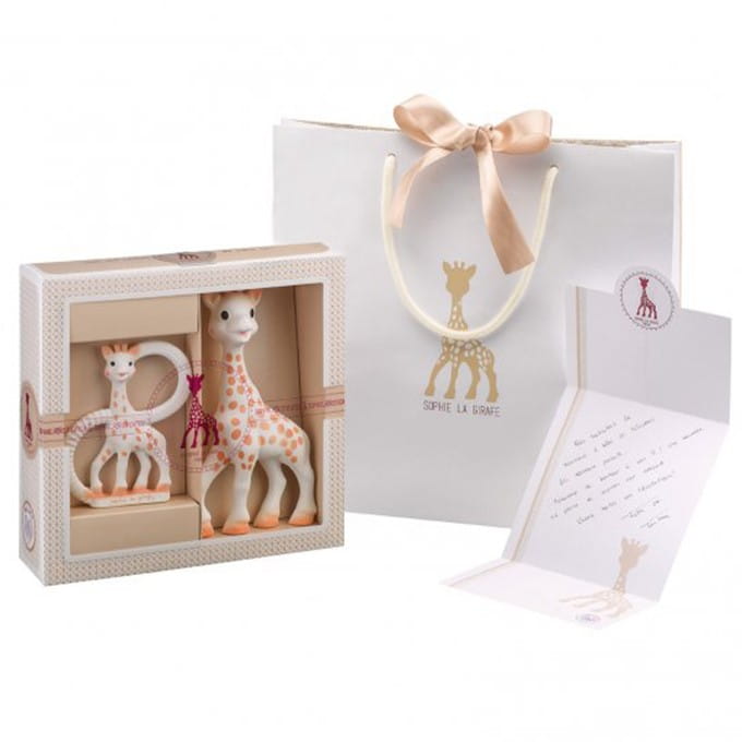 Zestaw prezentowy narodzinowy. Gryzak Żyrafa Sophie to uwielbiany przez dzieci na całym świecie kauczukowy gryzak. Żyrafka ma 18 cm wysokości, jest koloru złamanej bieli, z brązowymi cętkami, ma 4 nogi, parę uszu i parę rogów. Jej kształty są stworzone do małych rączek i do gryzienia. Żyrafka Sophie ma w środku piszczałkę. W zestawie dodatkowo mniejsza żyrafka w formie miękkiego gryzaczek kauczukowego, ozdobna torebka i kartka na życzenia.