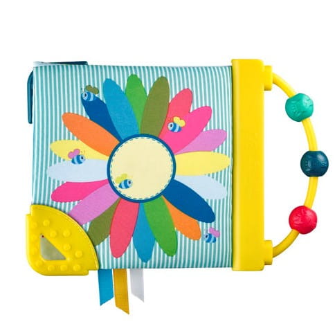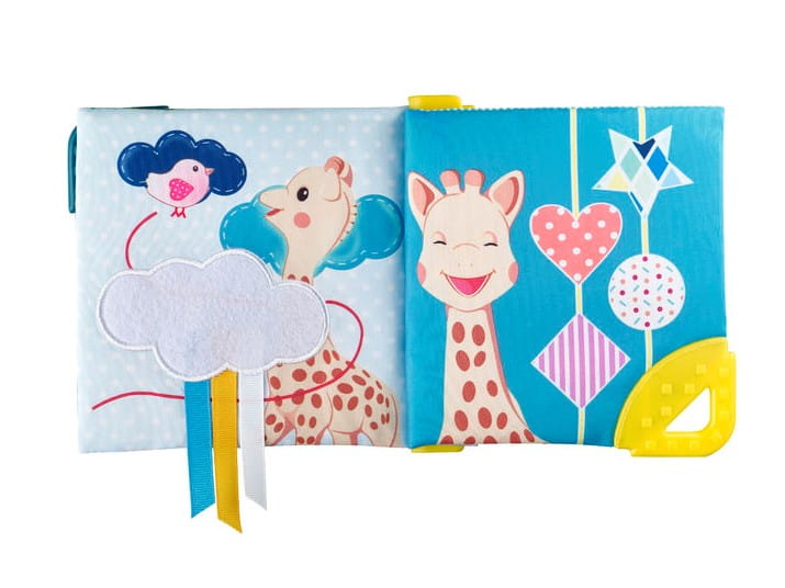 - miękka, kolorowa książeczka z przygodami żyrafki. W książeczce znajdziemy szeleszczące elementy, gryzak, różne faktury materiałów. Książeczka na grzbiecie posiada uchwyt do trzymania z koralikami do przesuwania i ćwiczenia małych paluszków,