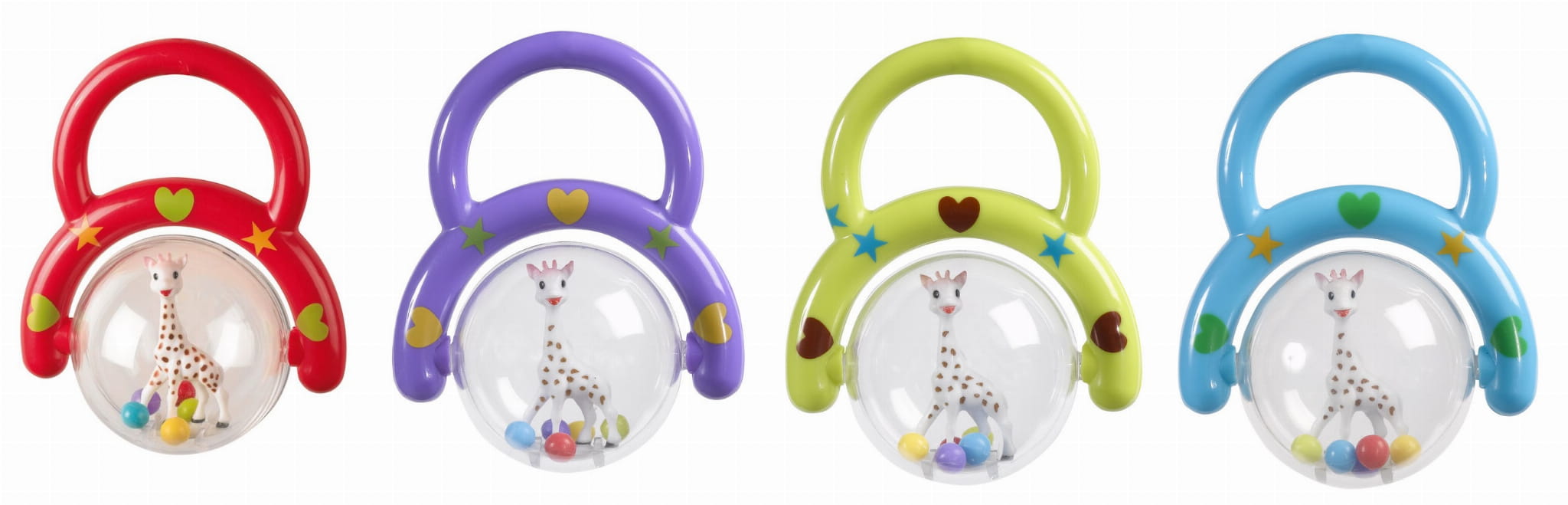 - lekka grzechotka z obracającą się kulą, dostosowana wielkością do małych rączek. Kolor grzechotki może być różny w zależności od partii produktu - zielony, niebieski, czerwony, fioletowy.