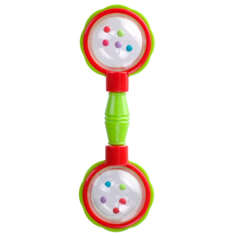 Dziecku łatwo chwycić ją w rączki. Zabawka posiada obrotowe elementy. Ma delikatnie zaokrąglone kształty. Przezroczyste części zabawki zawierają wewnątrz małe, kolorowe kuleczki, które poruszają się podczas zabawy i wywołują przyjemny dźwięk grzechotania. Zachęca dziecko do ćwiczeń i zabawy, stymulując jego rozwój psychomotoryczny.