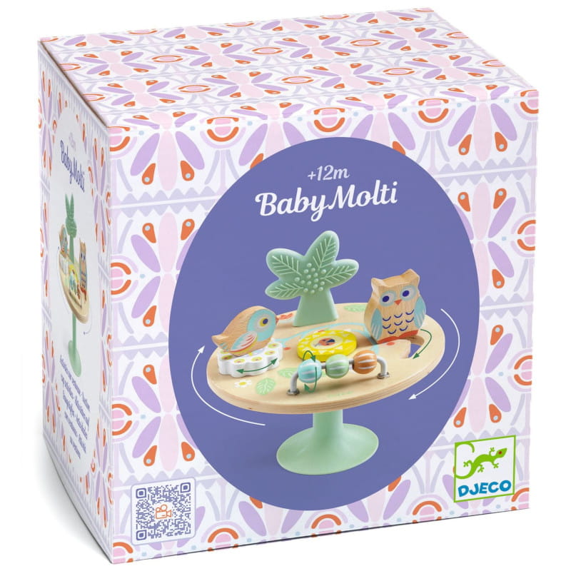 BabyMolti to obrotowa drewniana plansza z przymocowanymi ruchomymi elementami, które zaciekawią każdego maluszka.