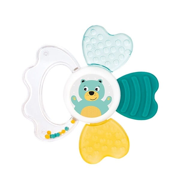 Zabawka łączy w sobie zalety gryzaka elastycznego i grzechotki, gdyż posiada miękkie części niosące ulgę ząbkującemu maluchowi.