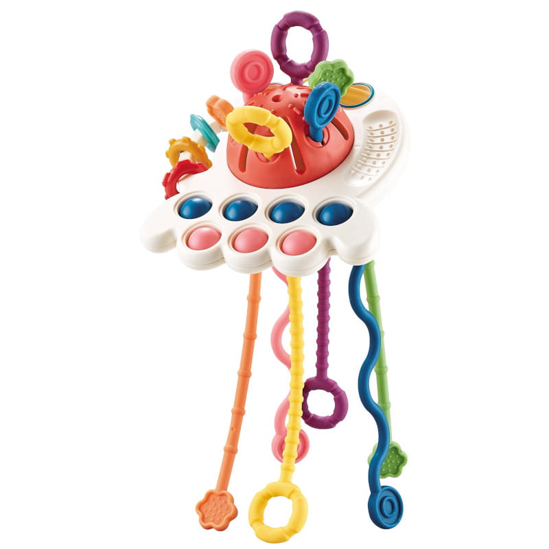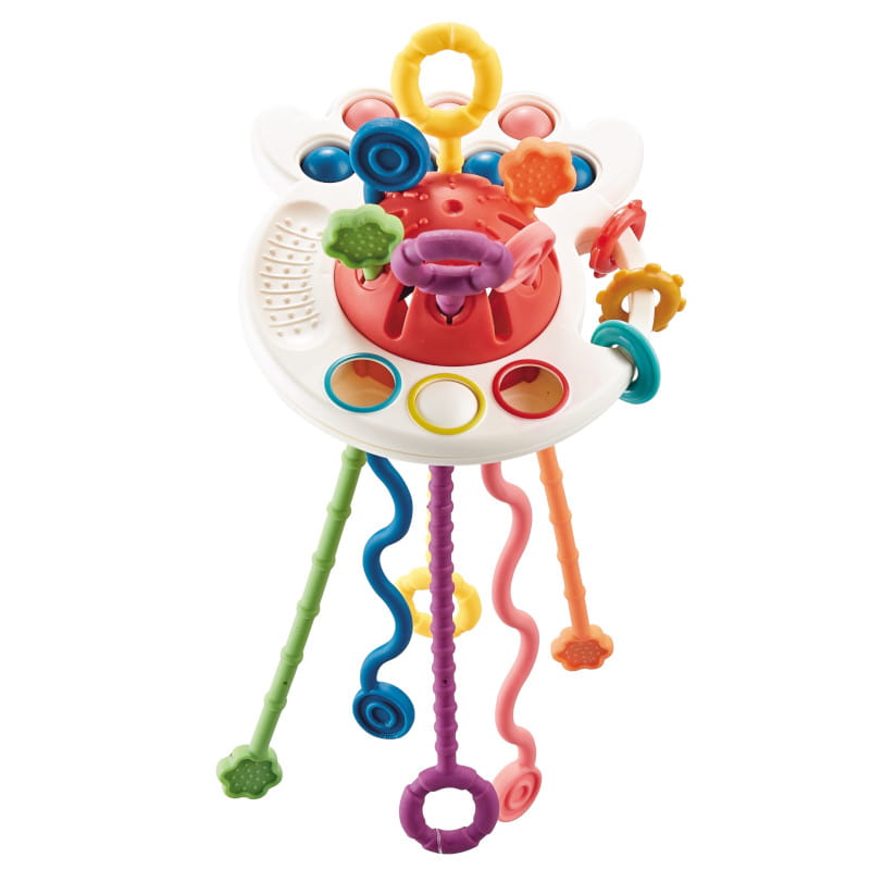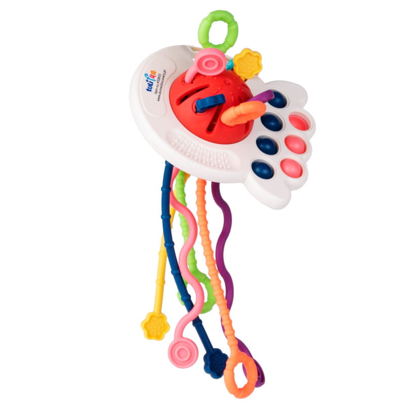 Zabawka wyposażona została w kolorowe kropeczki - bąbelki do wciskania, linki do przeciągania i koraliki do obracania.Te precyzyjne czynności pomogą najmłodszym ćwiczyć motorykę małą.