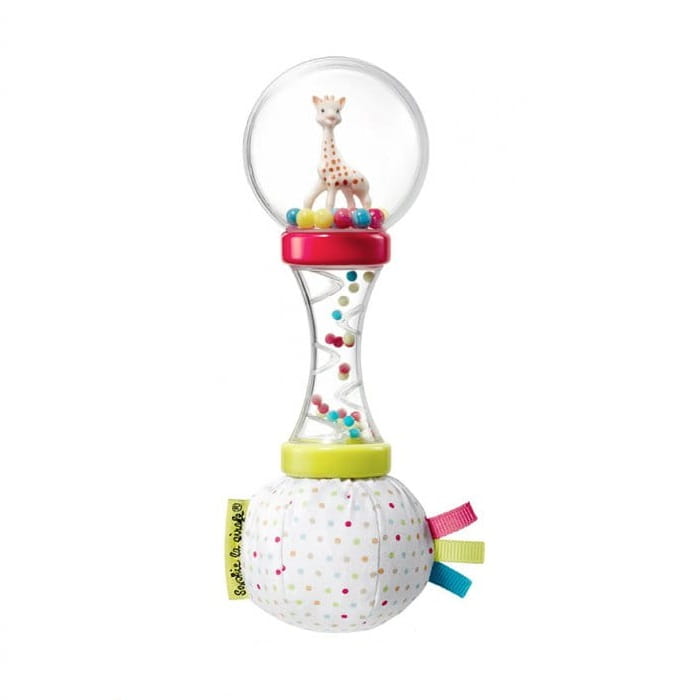 Na jednym końcu ma przezroczystą kulę z malutką żyrafką Sophie i kolorowymi kuleczkami w środku, na drugim - miękką, szeleszczącą kulę z metkami stymulująca doznania dotykowe. W przezroczystej części łączącej obie kule znajdują się przesypujące, grzechoczące kuleczki.