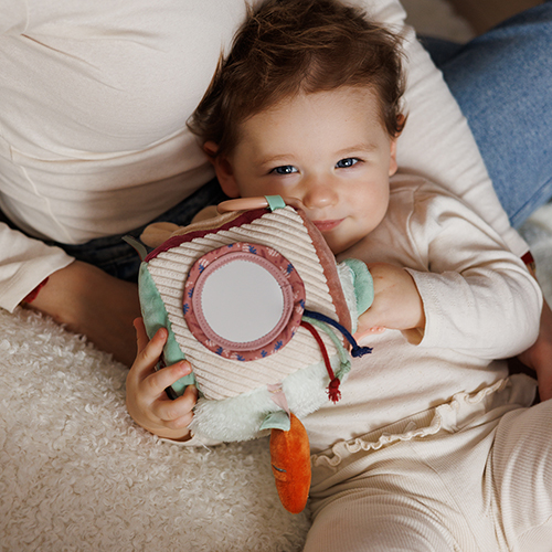 Wystające tasiemki i sznureczki to zachęta do chwytania, a bezpieczne lusterko - do odkrywania własnego odbicia.
