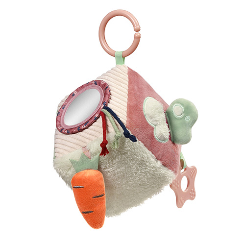 Kostka aktywizująca dla dzieci skrywa szeleścik i delikatną grzechotkę, które pobudzają słuch.