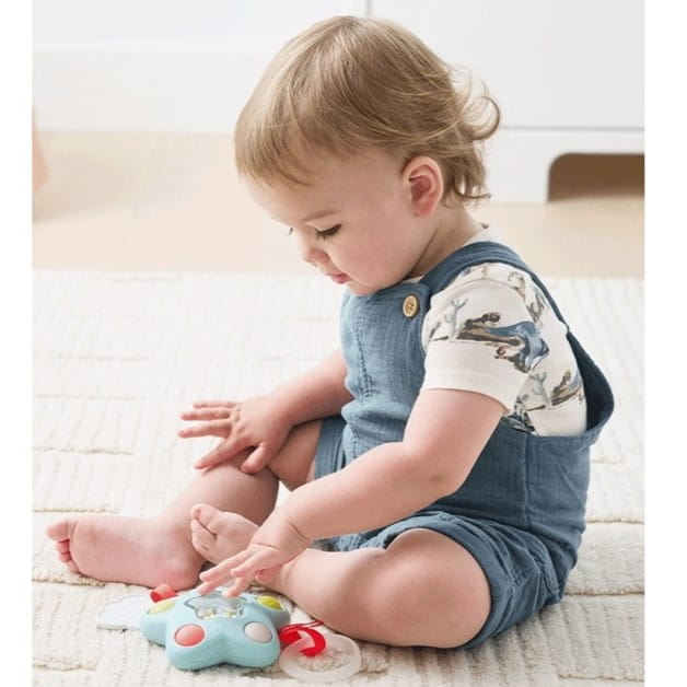 Ta urocza gwiazdka posiada przyciski typu pop-it, grzechotkę, wystające metki oraz gryzak. Zaprojektowana jest do zabawy sensorycznej i eksploracji. Aż pięć miękkich silikonowych wyskakujących elementów, daje przyjemność z naciskania, a jednocześnie pomaga rozwijać umiejętności motoryczne.