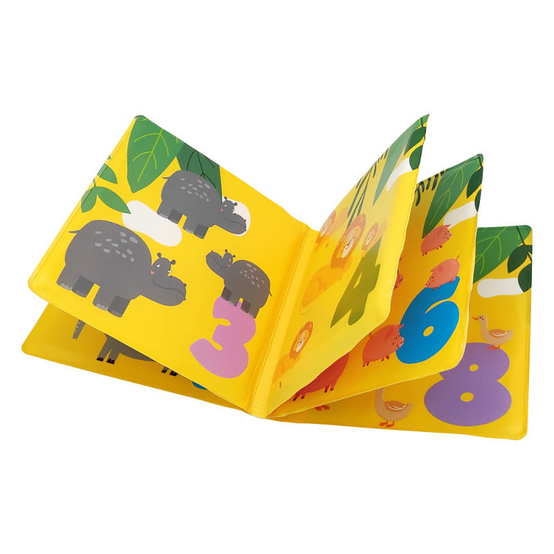Kolorowa książeczka kąpielowa ozdobiona motywem zwierzątek i cyferkami.