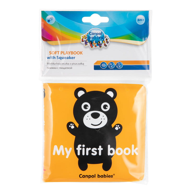 Miękka książeczka kontrastowa do kąpieli z piszczkiem marki Canpol Babies.