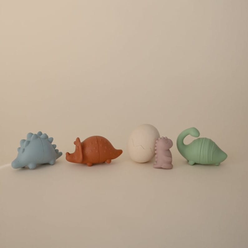 Zestaw składa się z 5 małych figurek inspirowanych dinozaurami z silikonu spożywczego. Zostały one stworzone, aby stymulować zmysły dzieci i wspierać ich rozwój poznawczy.