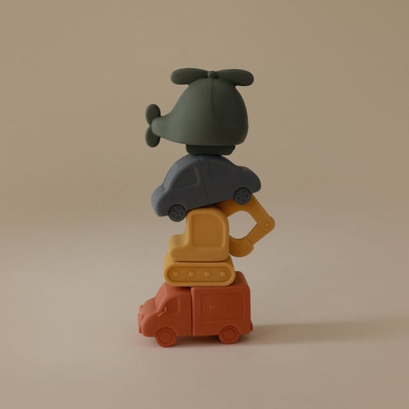 Zestaw składa się z 4 figurek wykonanych z silikonu spożywczego: helikoptera, samochodu, ciężarówki i koparki. Zostały one stworzone, aby stymulować zmysły dzieci i wspierać ich rozwój poznawczy.