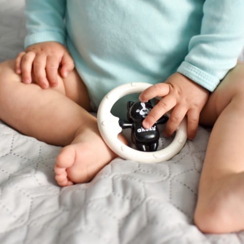 Grzechotka czarno-biała została zaprojektowana specjalnie dla najmłodszych dzieci. Wykonana z trwałych i bezpiecznych materiałów. Nie posiada ostrych krawędzi. Specjalnie dobrany kształt sprawia, że jest wygodna do uchwycenia i utrzymania w małych rączkach.