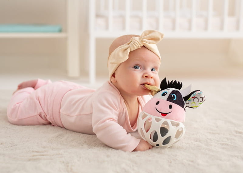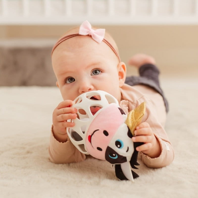 Sensoryczna Krówka, który jest zarazem piłką i grzechotką! Jej główka uszyta jest z materiałów o zróżnicowanej fakturze, zdobią ją materiałowe metki w różnych kolorach i szeleszczące uszka. Piłka wykonana jest z elastycznego tworzywa, a jej ażurowa budowa ułatwi chwytanie zabawki. Przy potrząsaniu wesoło grzechocze, zabawiając dziecko.