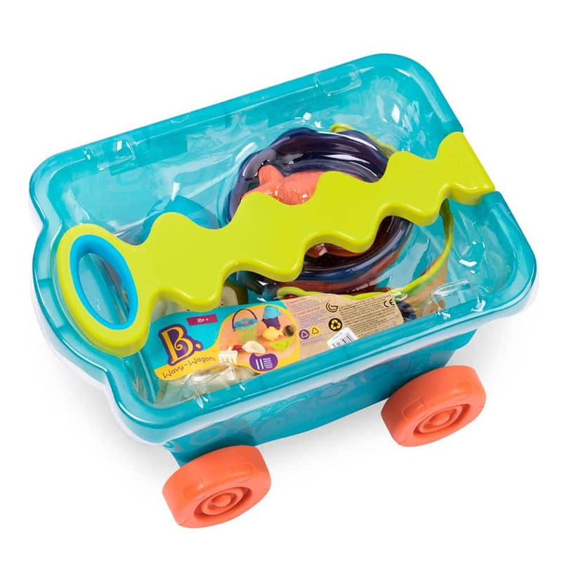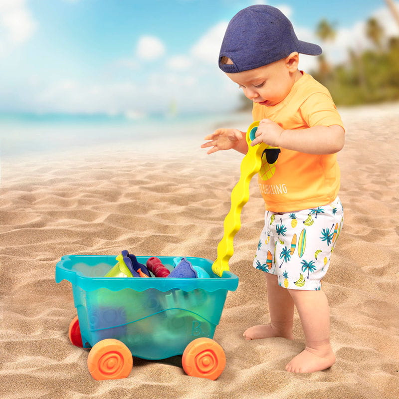 Wózek niebieski z akcesoriami do zabawy w piasku marki B.Toys.