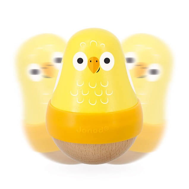 Zabawka ma postać żółtego ptaszka na zaokrąglonej podstawie, dzięki czemu buja się delikatnie na boki, powracając niezmiennie do pozycji pionowej.