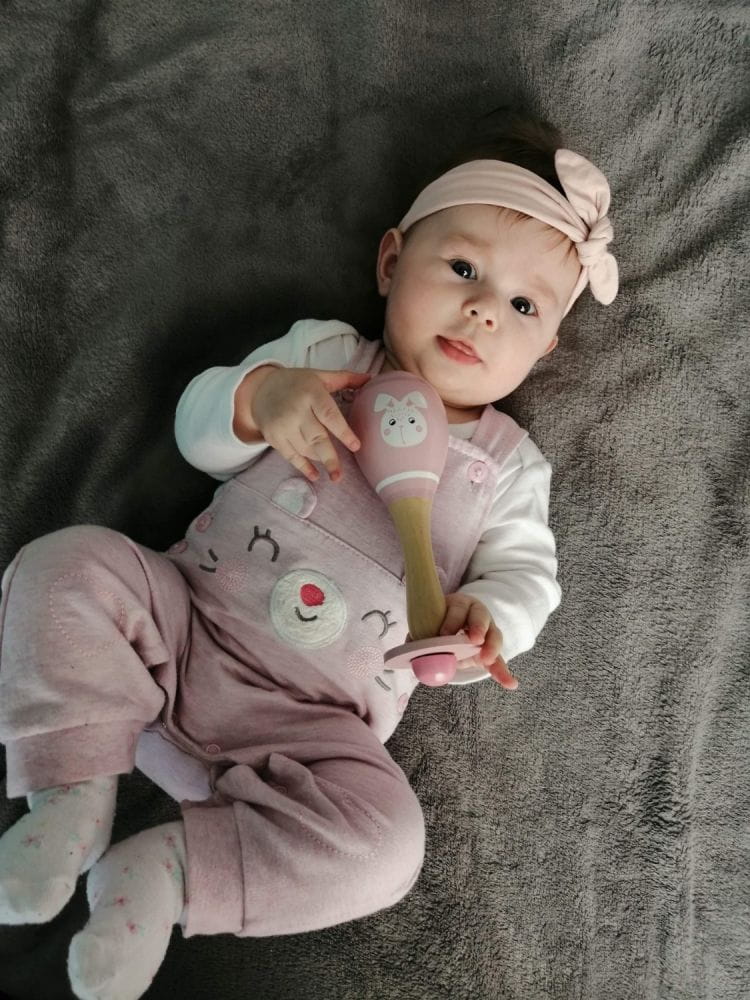 Marakas posiada zabezpieczenie (okrągły, miękki pierścień) przed głębokim wsadzeniem uchwytu zabawki do buzi.