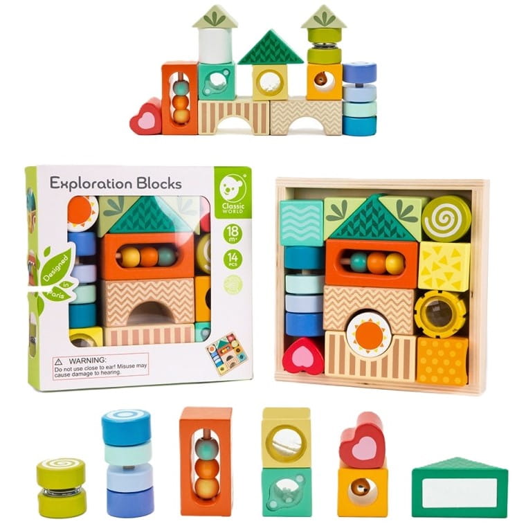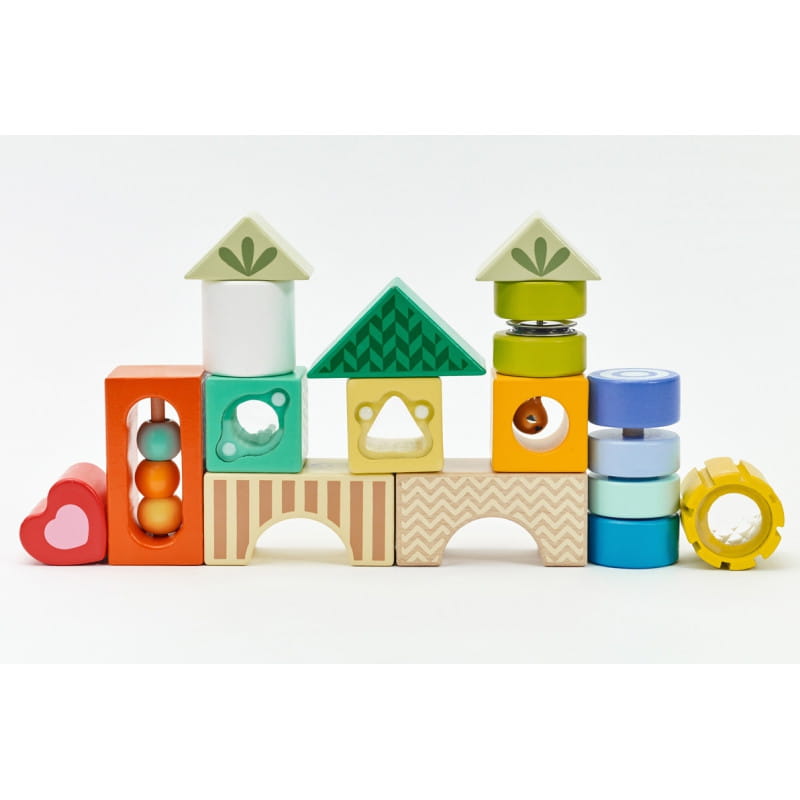 Zestaw zawiera 14 różnych klocków - 8 z nich ma dodatkowe aktywizujące elementy jak np. dzwoneczek, grzechotkę, kalejdoskop. Dziecko może z zaciekawieniem odkrywać ich właściwości.