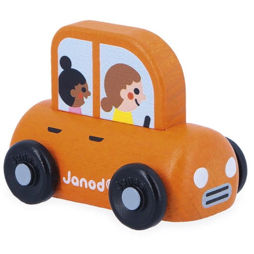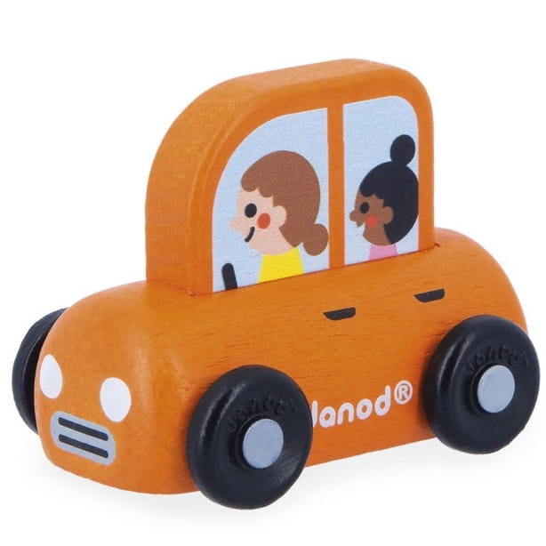 Samochód rodzinny z serii Cross Roads francuskiej marki JANOD to doskonałe uzupełnienie maty-dywanu do zabawy z drogą. Pojazd wykonany jest z drewna, posiada poręczne kształty dopasowane do małych rączek, pomarańczowy kolor, a dzięki kółkom łatwo porusza się po różnych powierzchniach. W środku znajdują się dwójka pasażerów (mama i dziecko), co zachęca malucha do snucia własnych historii i kreatywnej zabawy.