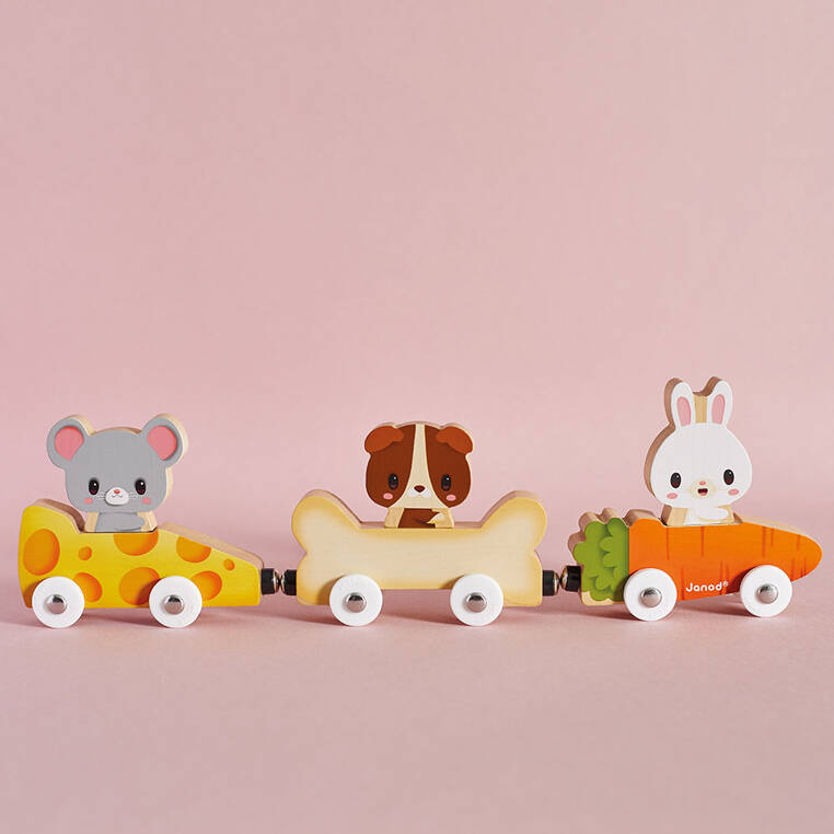 Zestaw drewnianych magnetycznych pojazdów ze zwierzątkami domowymi z kolekcji Farma francuskiej marki Janod.