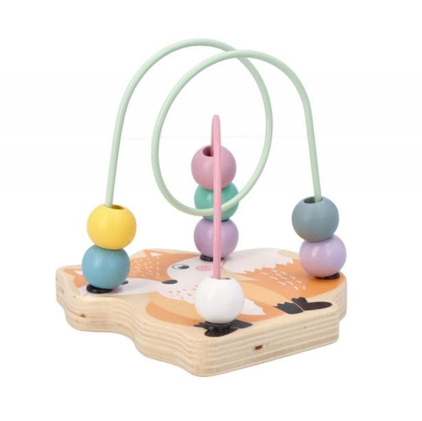 Zabawka motoryczna do przesuwania drewnianych koralików i ćwiczenia sprawności paluszków i dłoni najmłodszych dzieci. Zabawka składa się z drewnianej podstawki z wizerunkiem Liska, 2 metalowych drucików - na każdym umieszczone są 4 drewniane kolorowe koraliki.