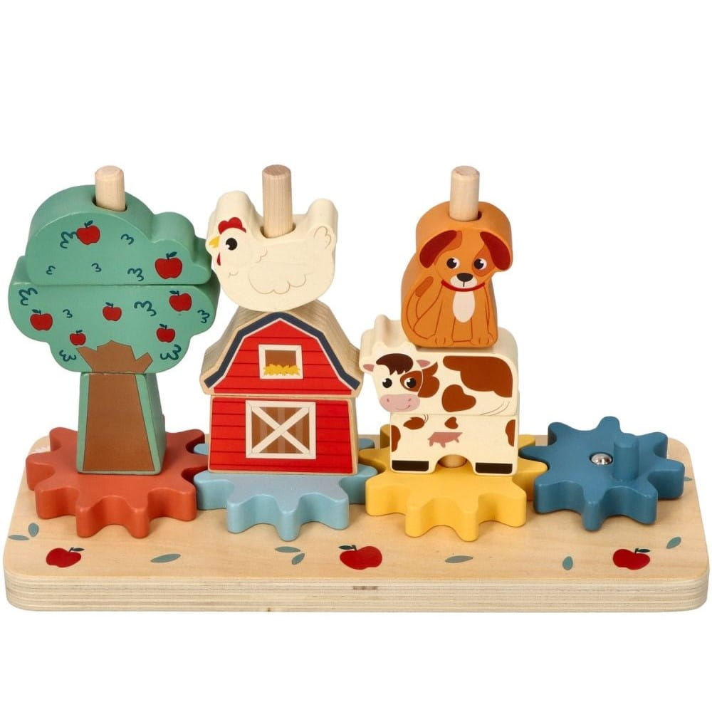 Układanka na paliku z klockami z kołami zębatymi do kręcenia.