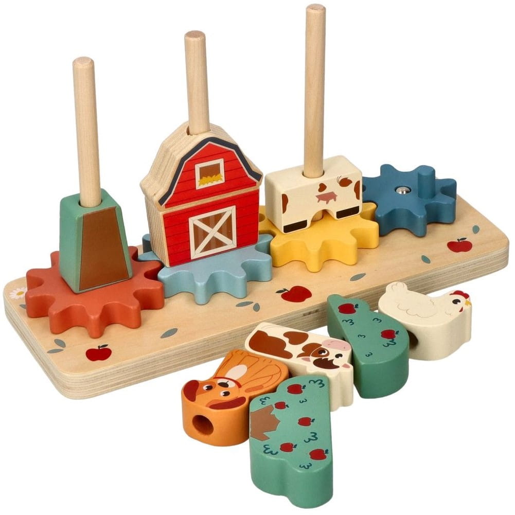 Zadanie dziecka to ułożyć na palikach odpowiednio elementy, którymi może potem kręcić za pomocą korbki na jednej z zębatek, lub obracając paliki.