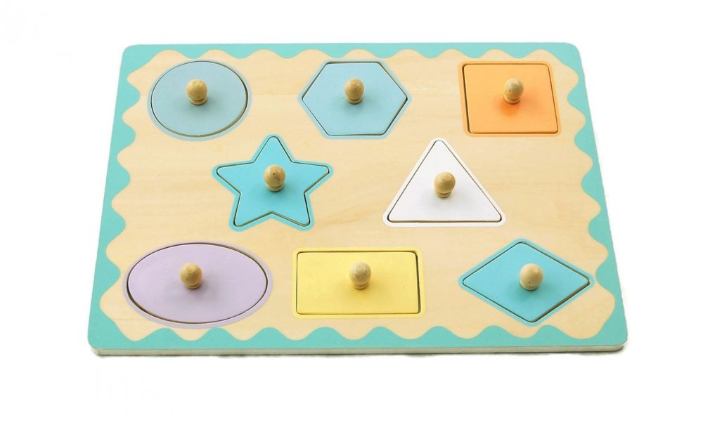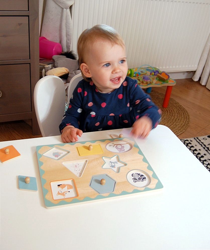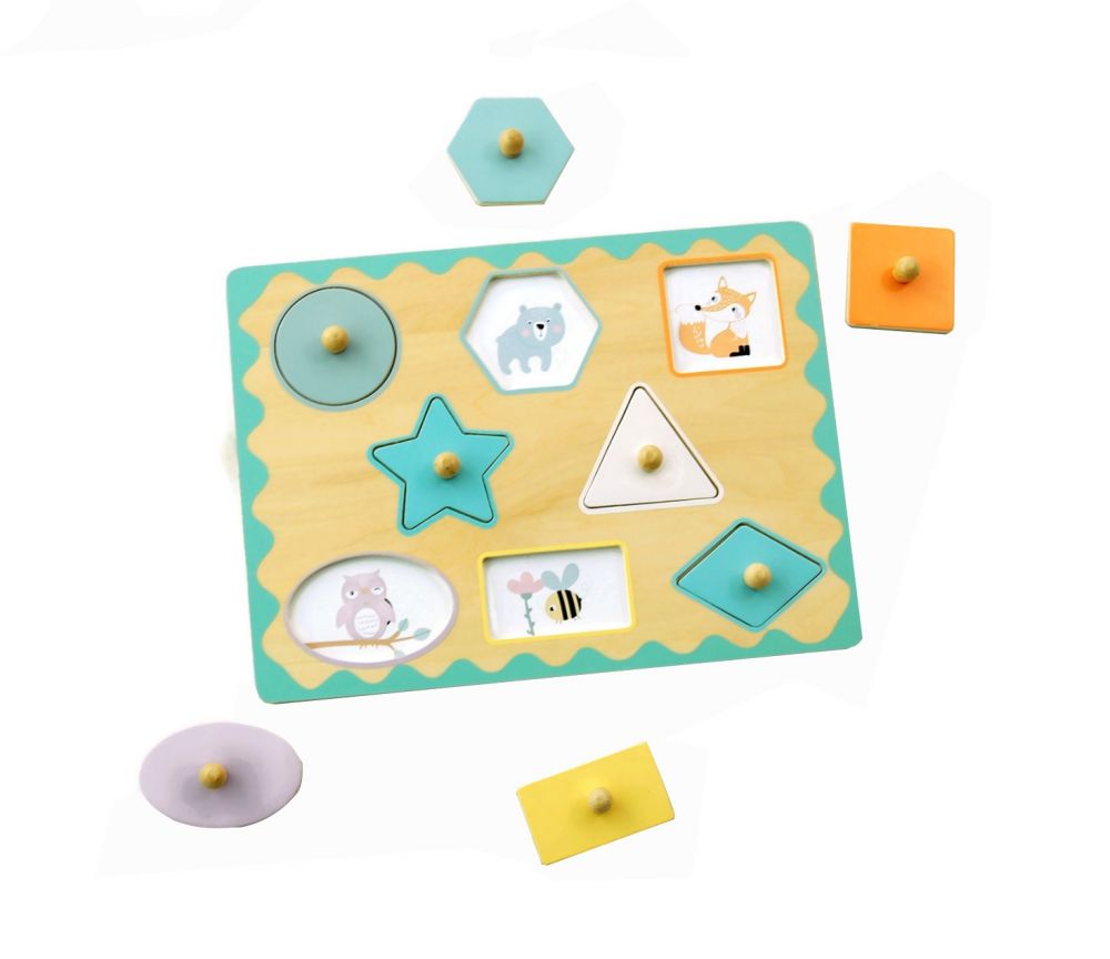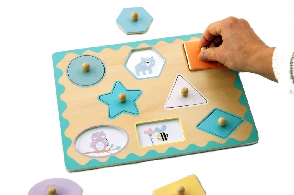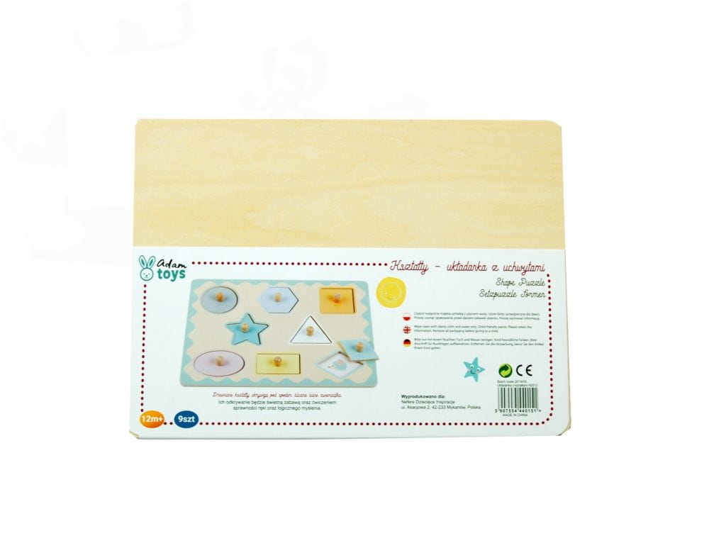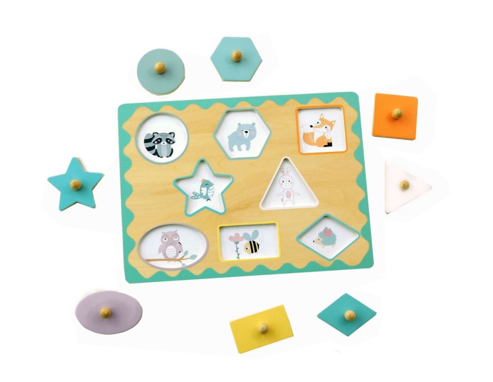 Drewniana układanka z uchwytami Kształty doskonali spostrzegawczość oraz zdolności motoryczne, wspiera rozwój koordynacji oko-ręka dzięki ćwiczeniu trafiania w odpowiednie okienko, pomaga w nauce kształtów i kolorów oraz zwierzątek.