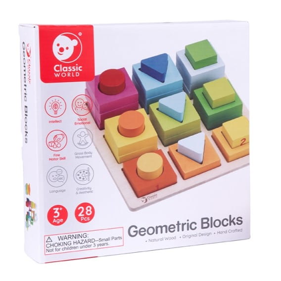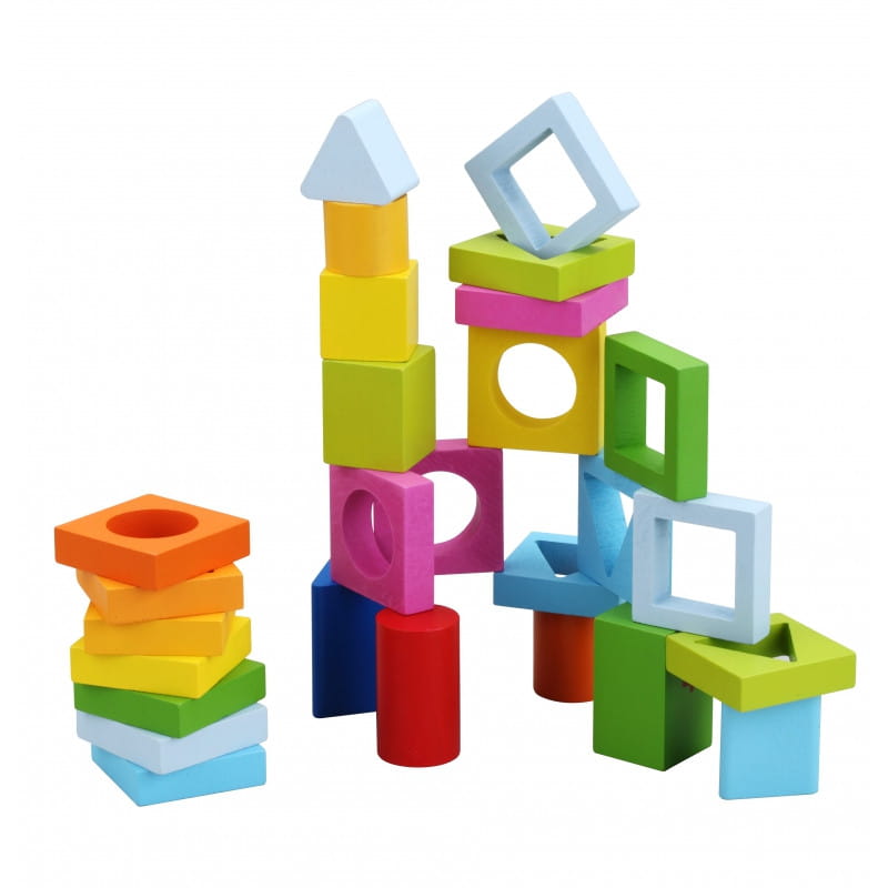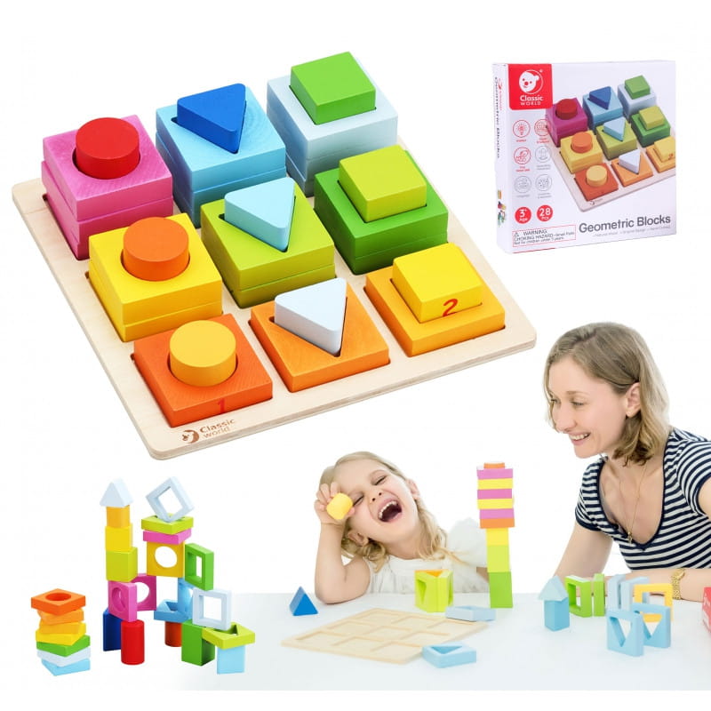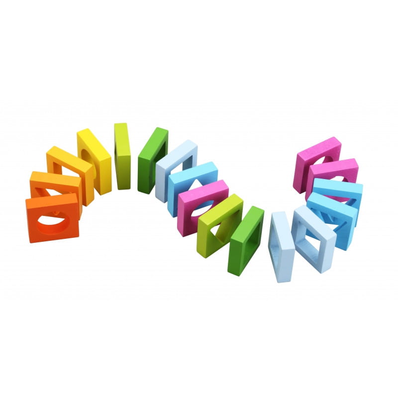 Cały zestaw składa się łącznie z 28 elementów wykonanych z naturalnego drewna. Na planszy znajduje się 9 jednakowych kwadratowych otworów na baziew które można dopasowywać klocki.