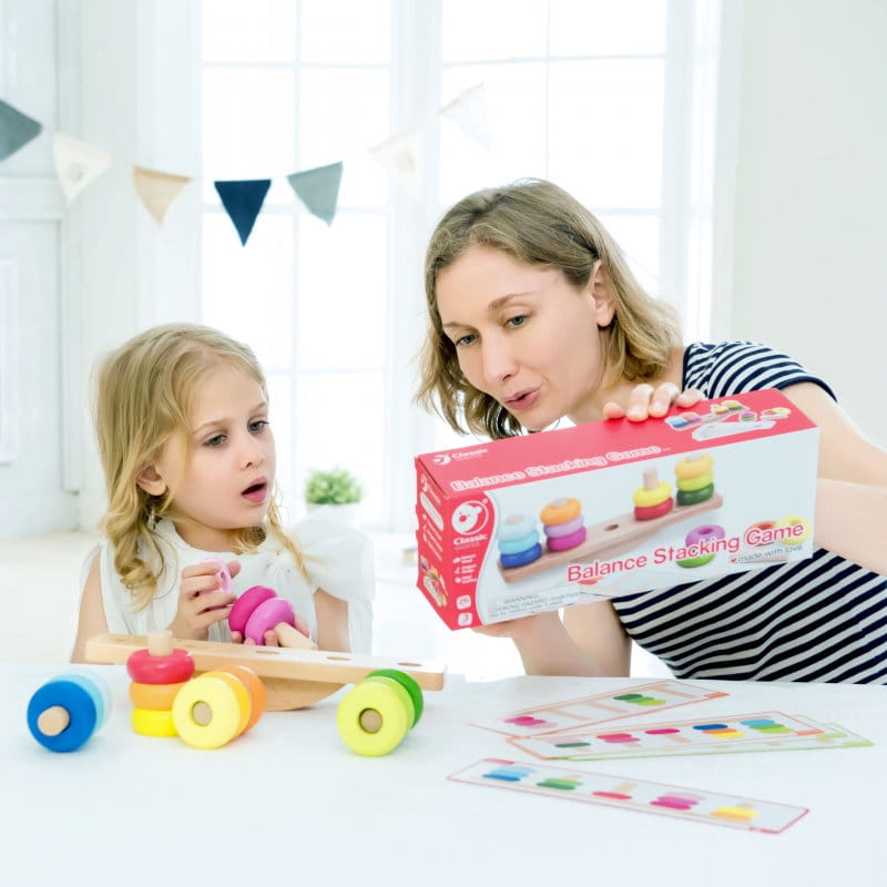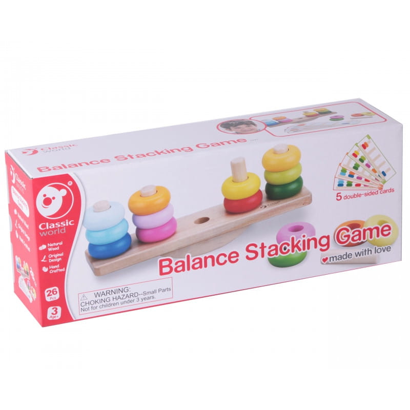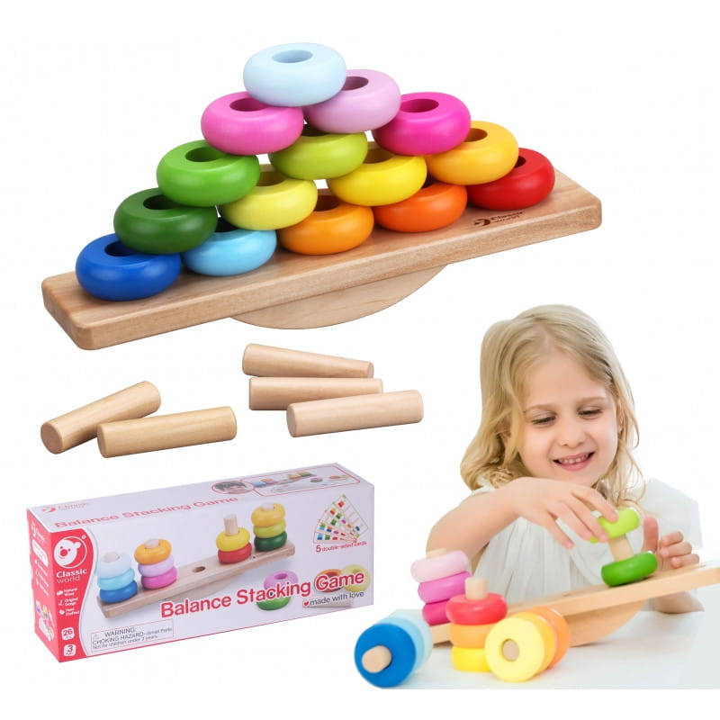 Dziecko bawiąc się sprawdza co się stanie po dołożeniu klocków z jednej strony. Musi to zrobić w odpowiedniej kolejności tak, aby pochylnia nie przechyliła się zbytnio na jedną stroną i nie dotknęła podłoża. Klocki można dokładać w różny sposób, aby przetestować różne kombinacje i sposoby równoważenia się elementów po obu stronach. Wyjmowane kołeczki pozwalają na układaniu krążków na różne sposoby, o różnym stopniu trudności.