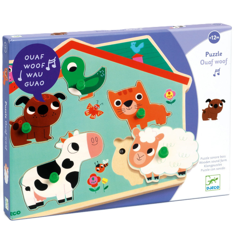 Drewniane puzzle od Djeco nauczą dzieci rozpoznawania dźwięków wydawanych przez zwierzęta.
