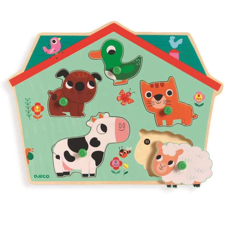 Zadanie polega na dopasowaniu puzzli w kształcie zwierząt do pasujących otworów na drewnianej podstawce. Gdy element znajdzie się we właściwym miejscu wyda odpowiedni dźwięk. Puzzle posiadają uchwyty, aby dziecku łatwiej było je chwycić.