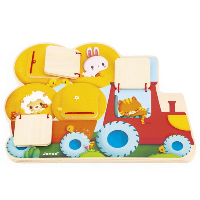 Idealna zabawka dla dzieci od 1. roku życia. Ma kształt traktora z przyczepą pełną beli siana. To właśnie w nich oraz w kabinie ukryły się różne zwierzątka – kotek, kurka, myszki i inne. Aby je odnaleźć, należy odchylić drewniane okienka.